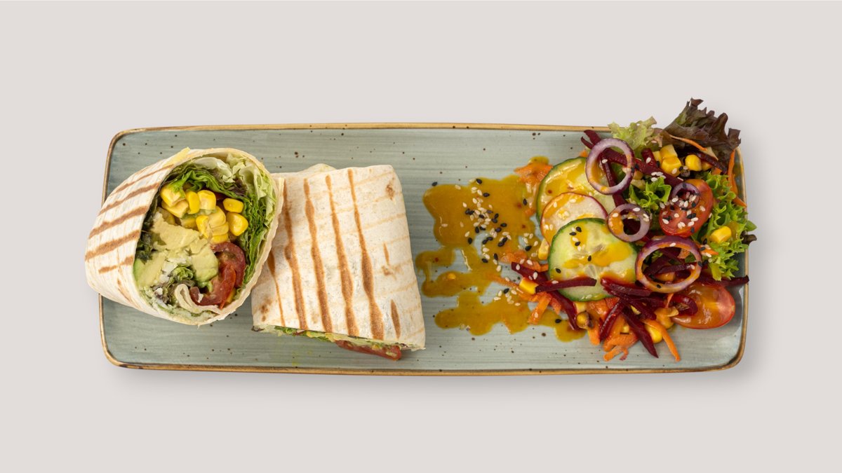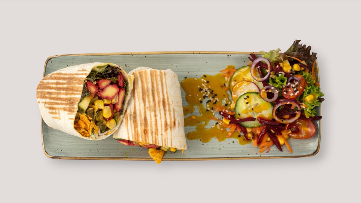 with tofu, mango, bean sprouts, goma wakame, corn, chia seeds, nori and avocado