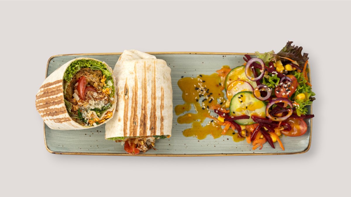 with falafel, vegan cheese, fried onions, tomatoes, nacho chips and coriander