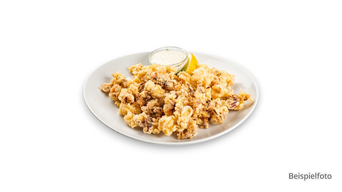 Baby-Kalamari aus der Pfanne mit Tomatensoße, Feta, Schafskäse, Paprika und Butterreis