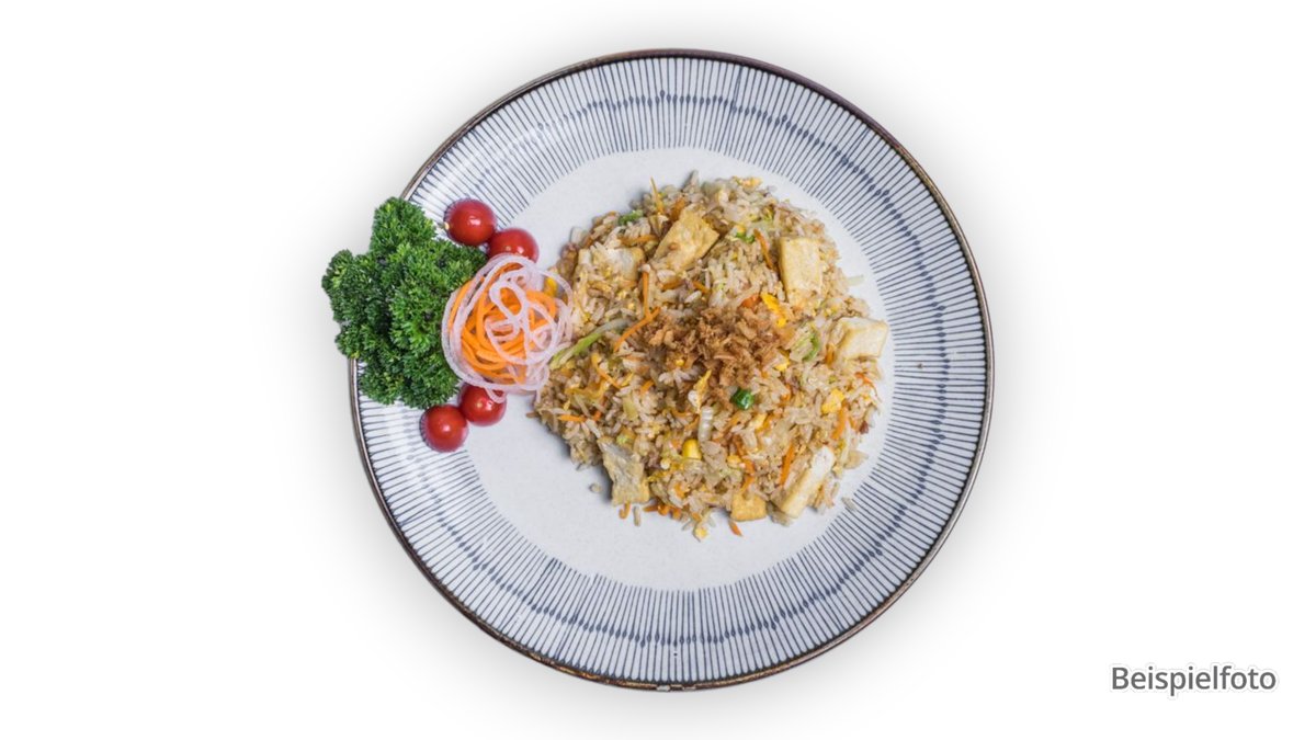 fried rice with fresh vegetables, pak choi, bean sprouts and roasted onions, with an ingredient of your choice