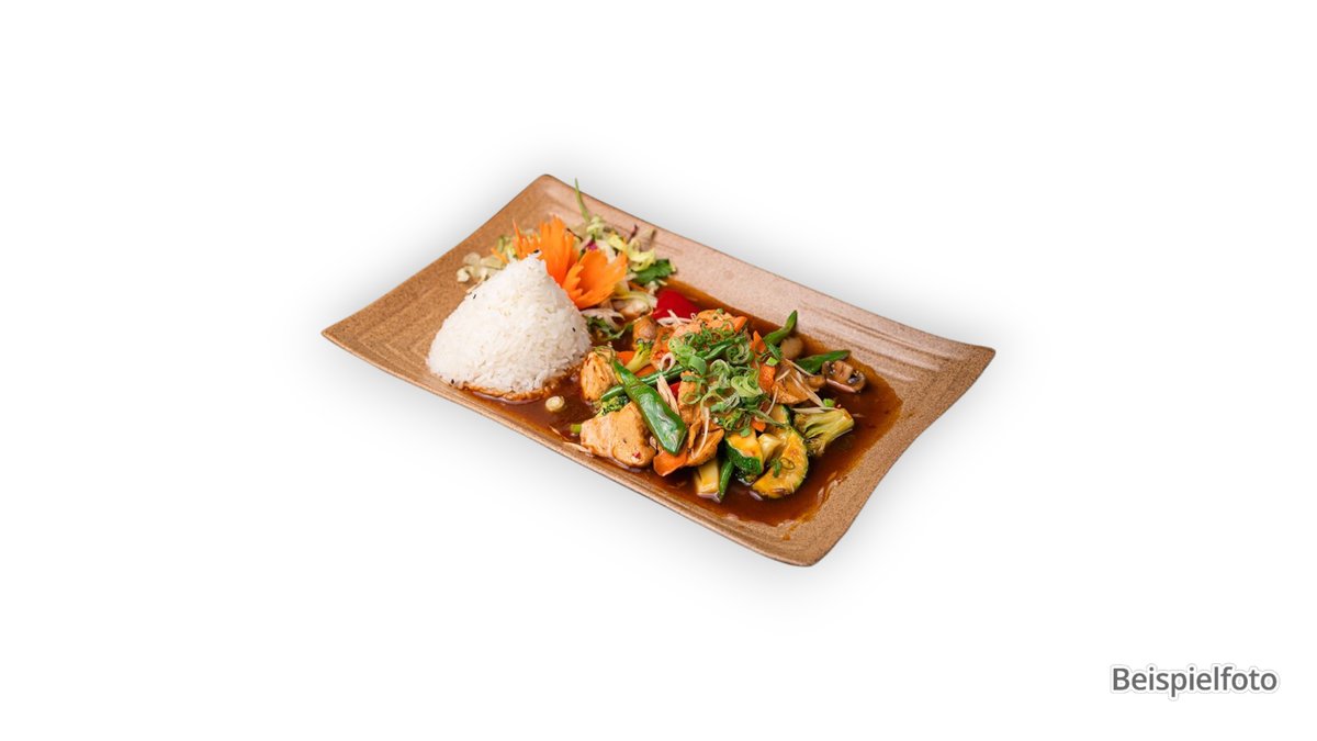 slightly spicy fresh vegetables with lemongrass, chili peppers, snow peas, and spring onions, served with fragrant rice and an ingredient of your choice