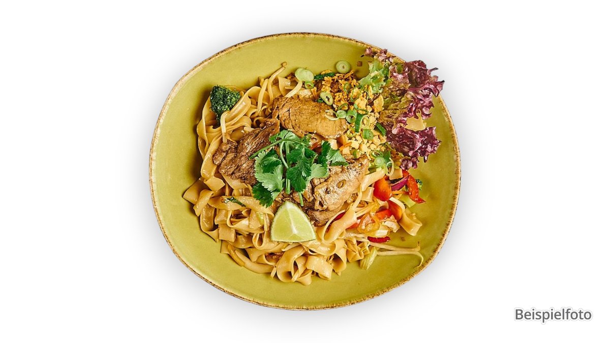 fried rice noodles with fresh vegetables, pak choi, bean sprouts, spring onions, roasted peanuts, roasted onions and coriander, with an ingredient of your choice
