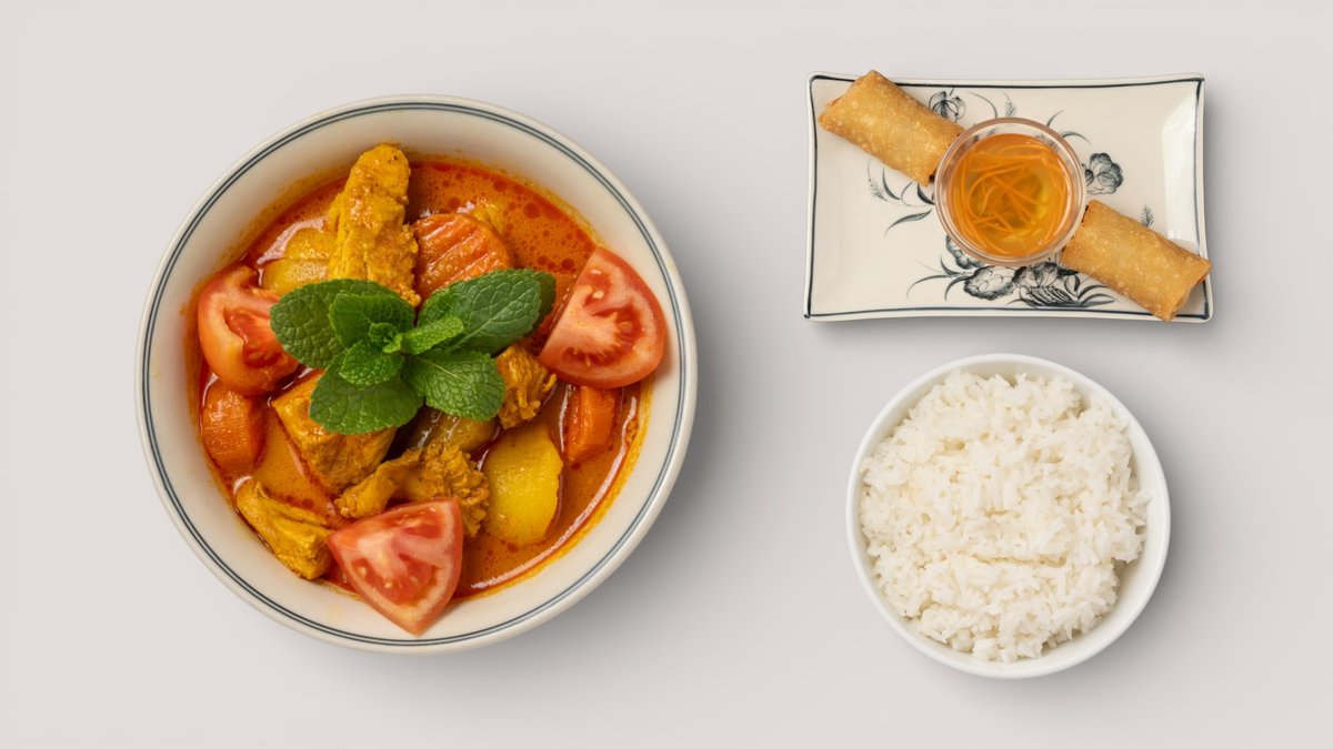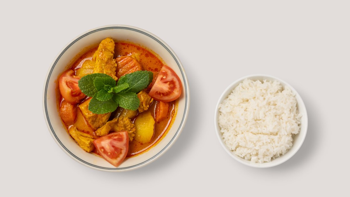 vietnamesisches Kartoffel-Curry mit Hähnchen, Karotten, Tomaten, Minze und Reis