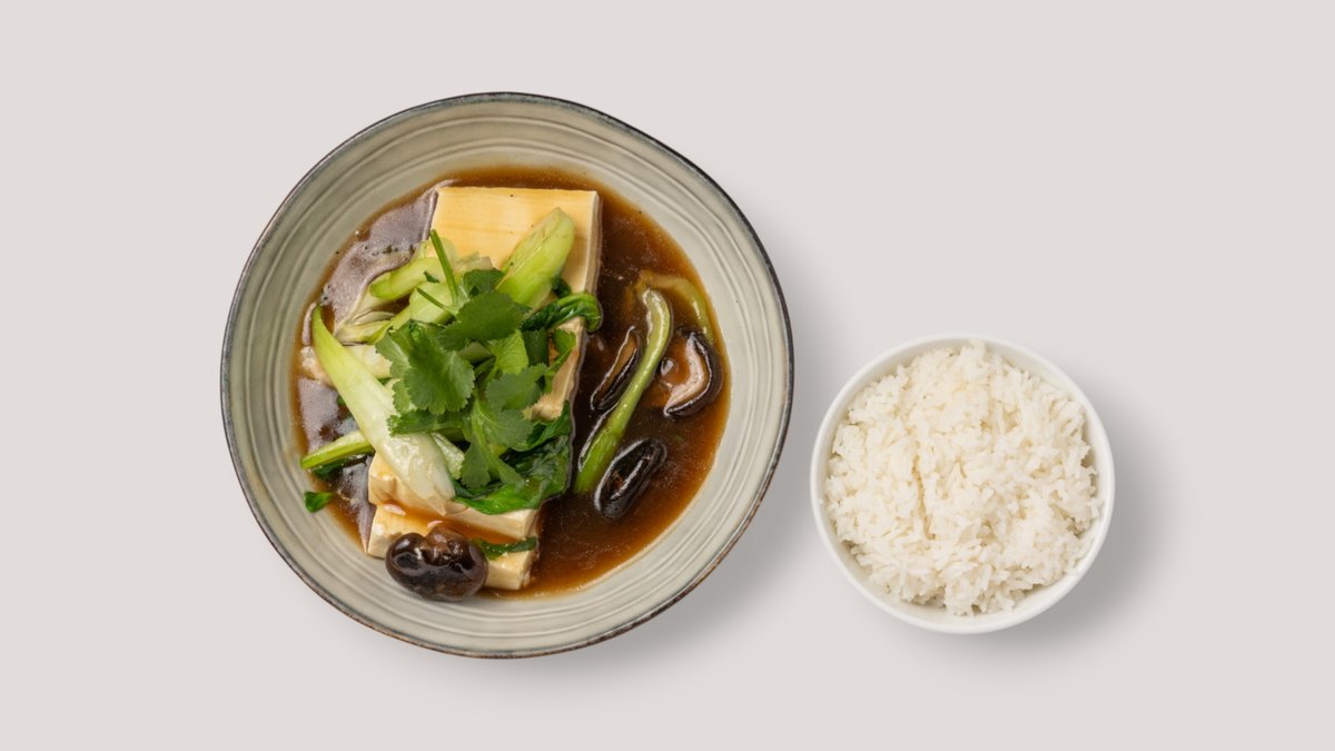 gedämpfter Seidentofu mit Pak Choi in cremiger Shiitake-Sojasoße