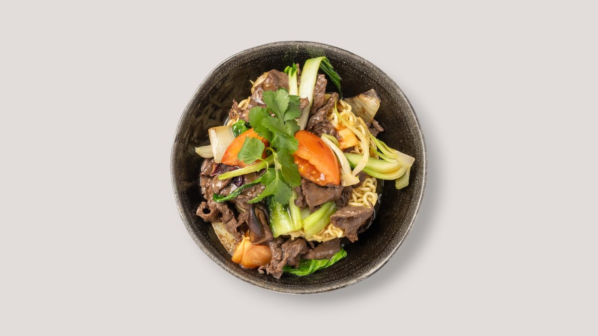 knusprig frittierte Nudeln mit einem Fleisch deiner Wahl, Pak Choi, Shiitake, Tomaten, Zwiebeln und Koriander