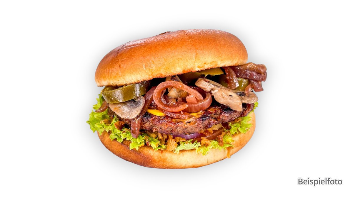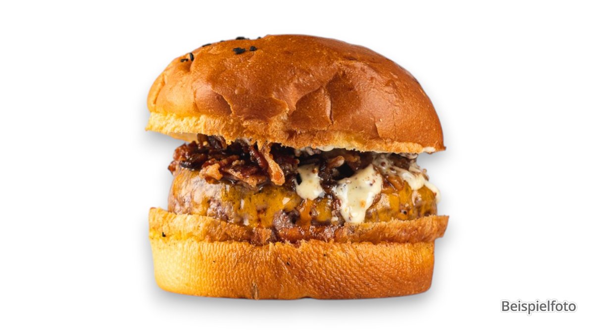 mit doppel Smash-Patty vom Rind und Schwein, doppelt Cheddar, Onion Jam, doppelt Bacon und Burgersoße