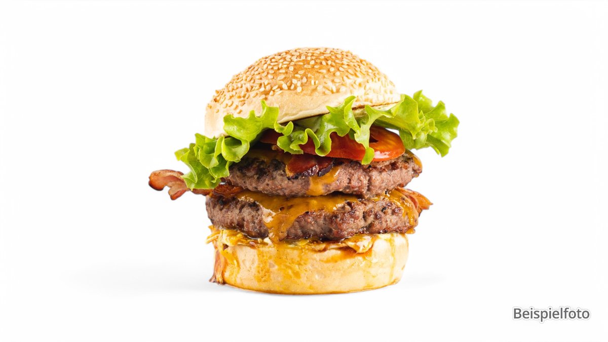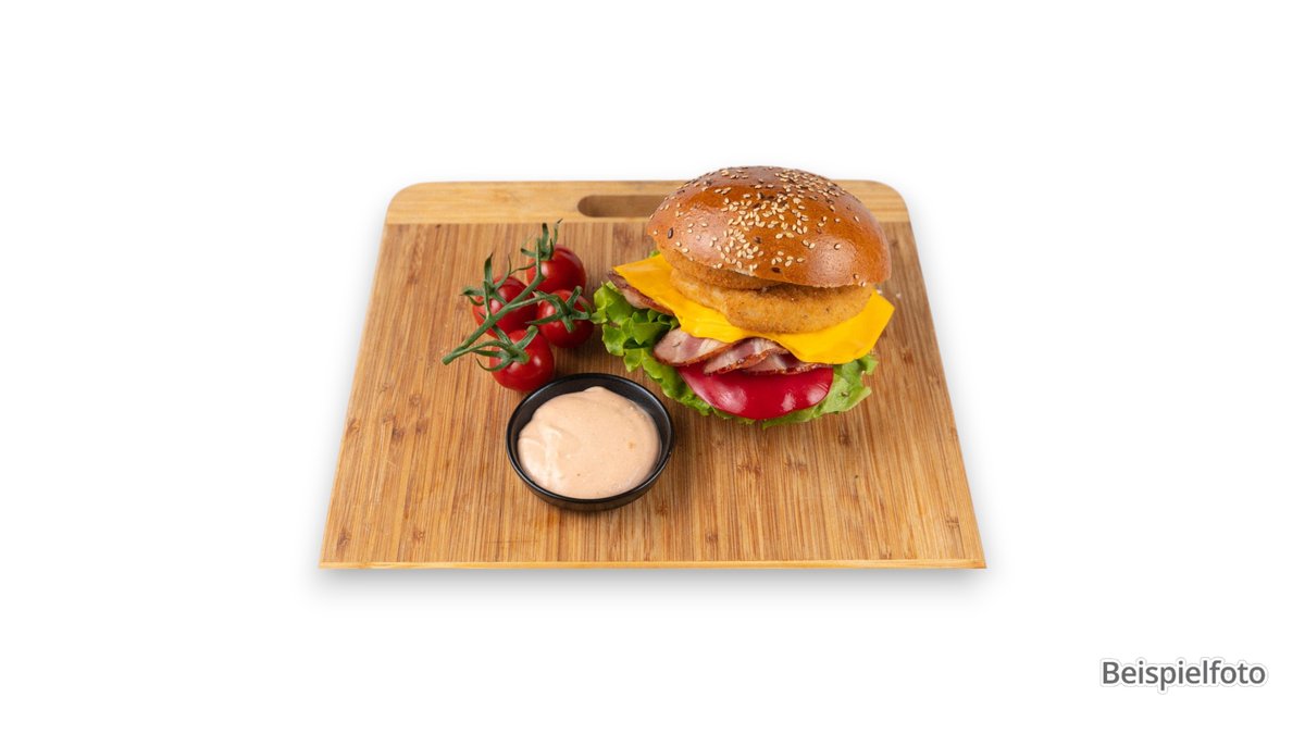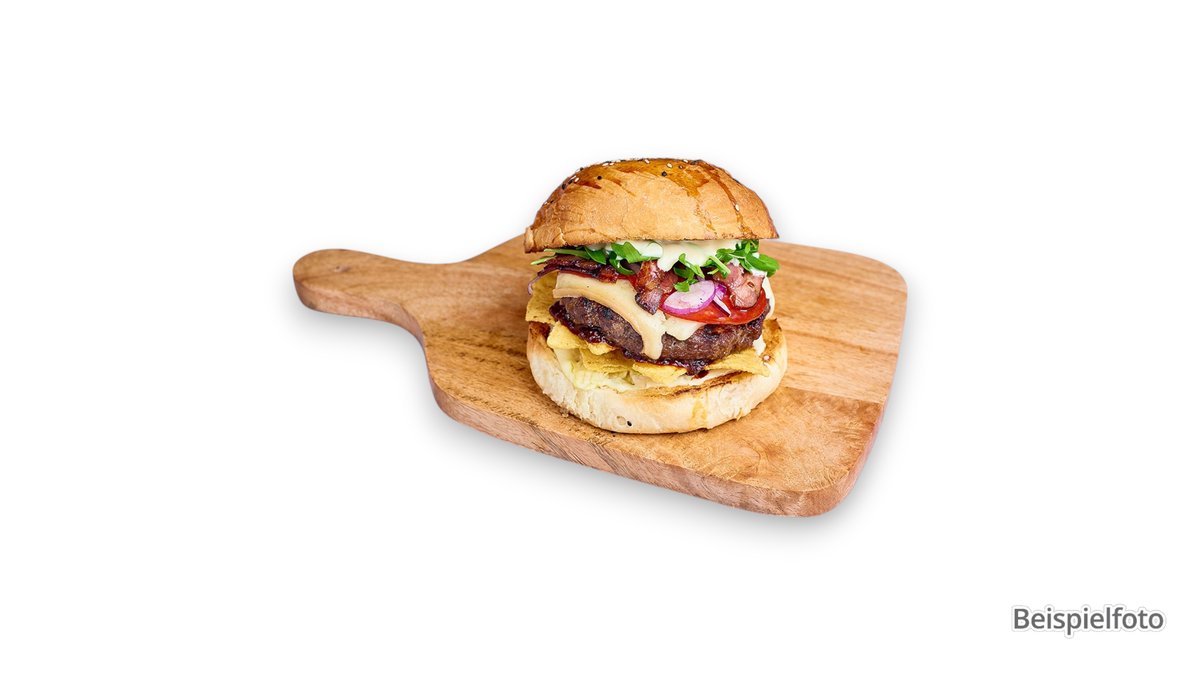mit doppel Smash-Patty vom Rind und Schwein, doppelt Cheddar, Bacon, Barbecuesoße und Burgersoße
