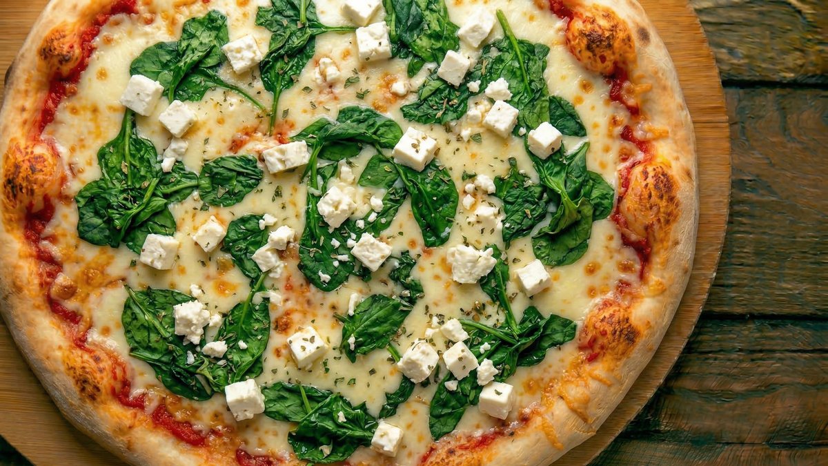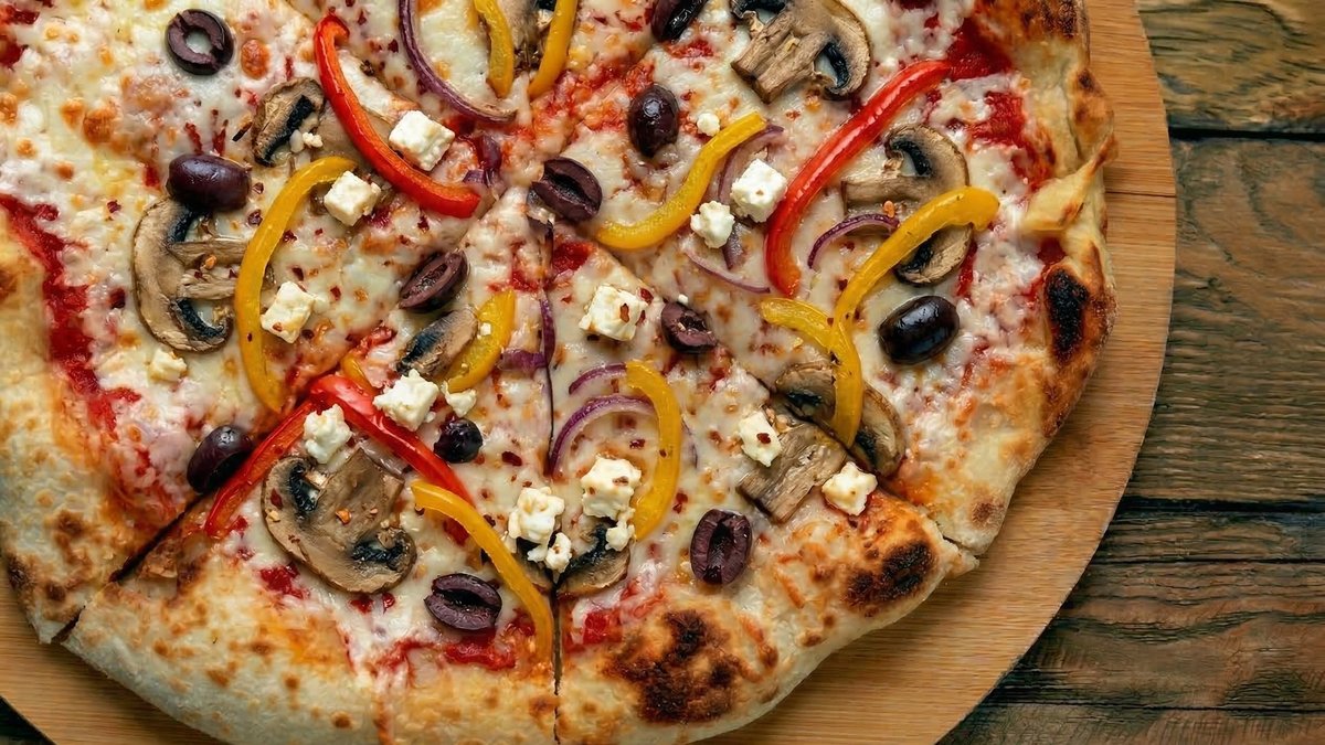 mit Champignons, Paprika, roten Zwiebeln, Feta, Knoblauch und schwarzen Oliven
