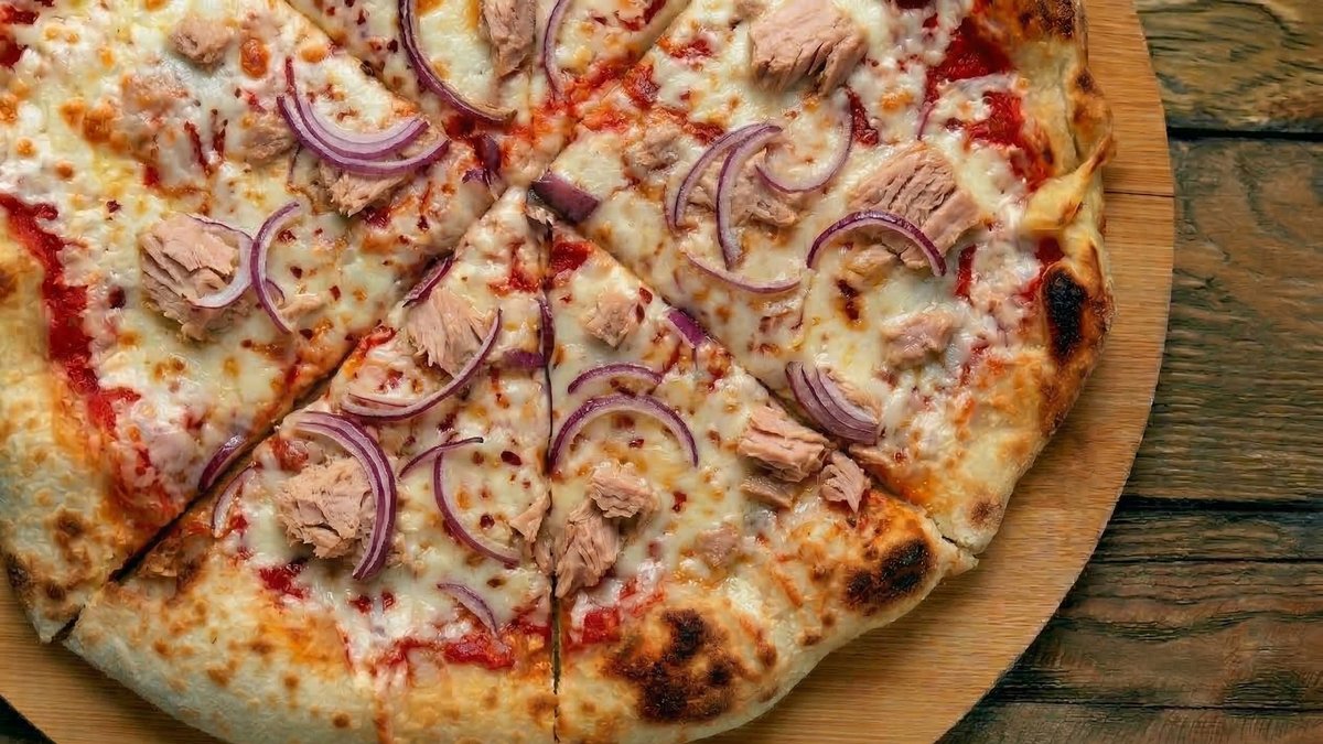 mit Thunfisch, roten Zwiebeln, Rucola, Mozzarella-Bällchen, Ei und Mais