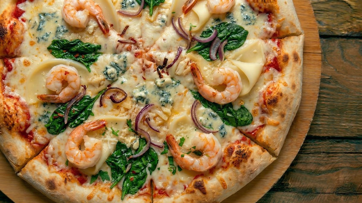 mit Garnelen, Spinat, Zwiebeln, Knoblauch und Petersilie