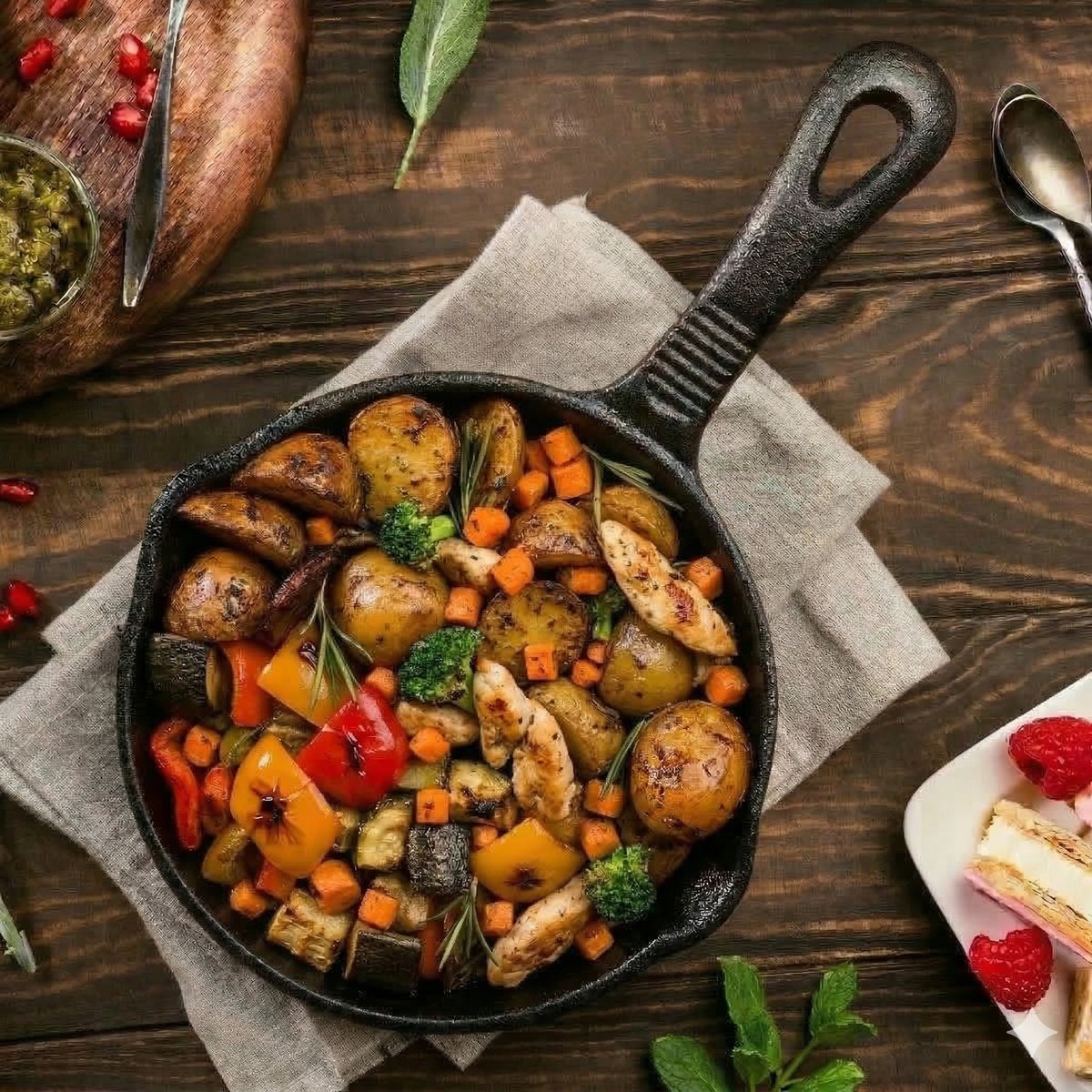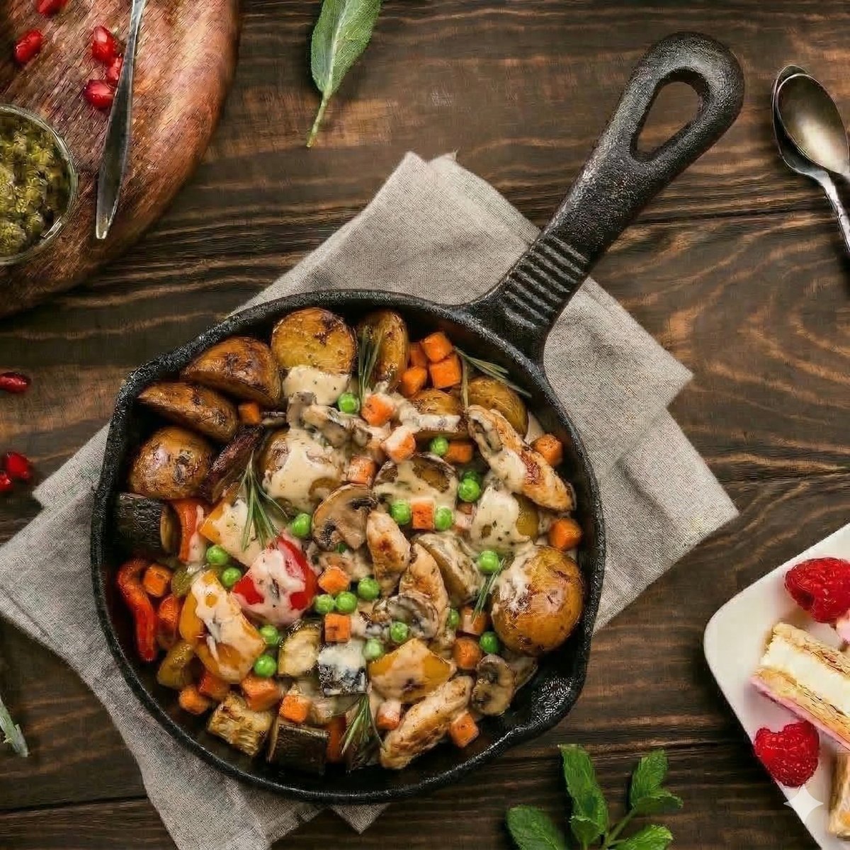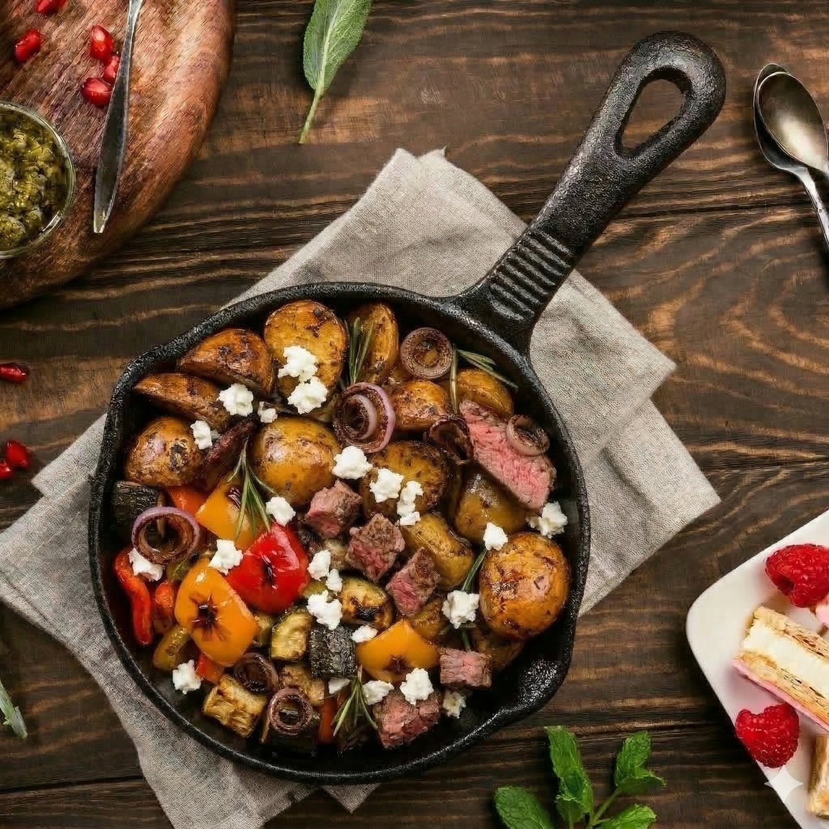Zarte Rumpsteak-Streifen mit Paprika, Rossmarin-Kartoffeln, Schalotten, Zucchini, Kirschtomaten und cremigen Ziegenkäse in der Pfanne serviert