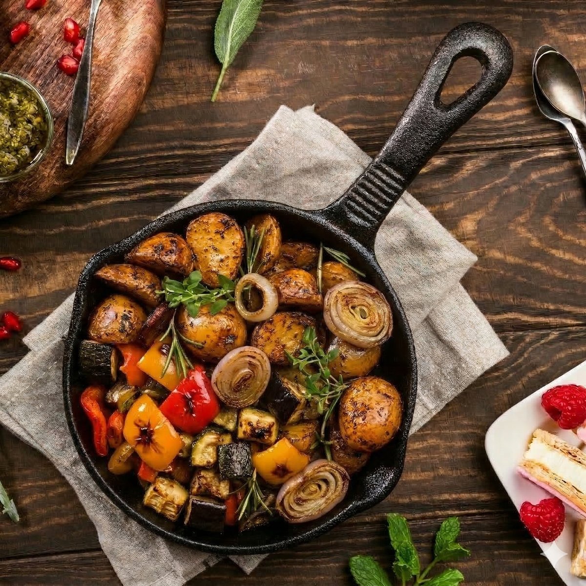 mit Paprika, Rosmarin-Kartoffeln, Schalotten, Aubergine, Zucchini, Knoblauch