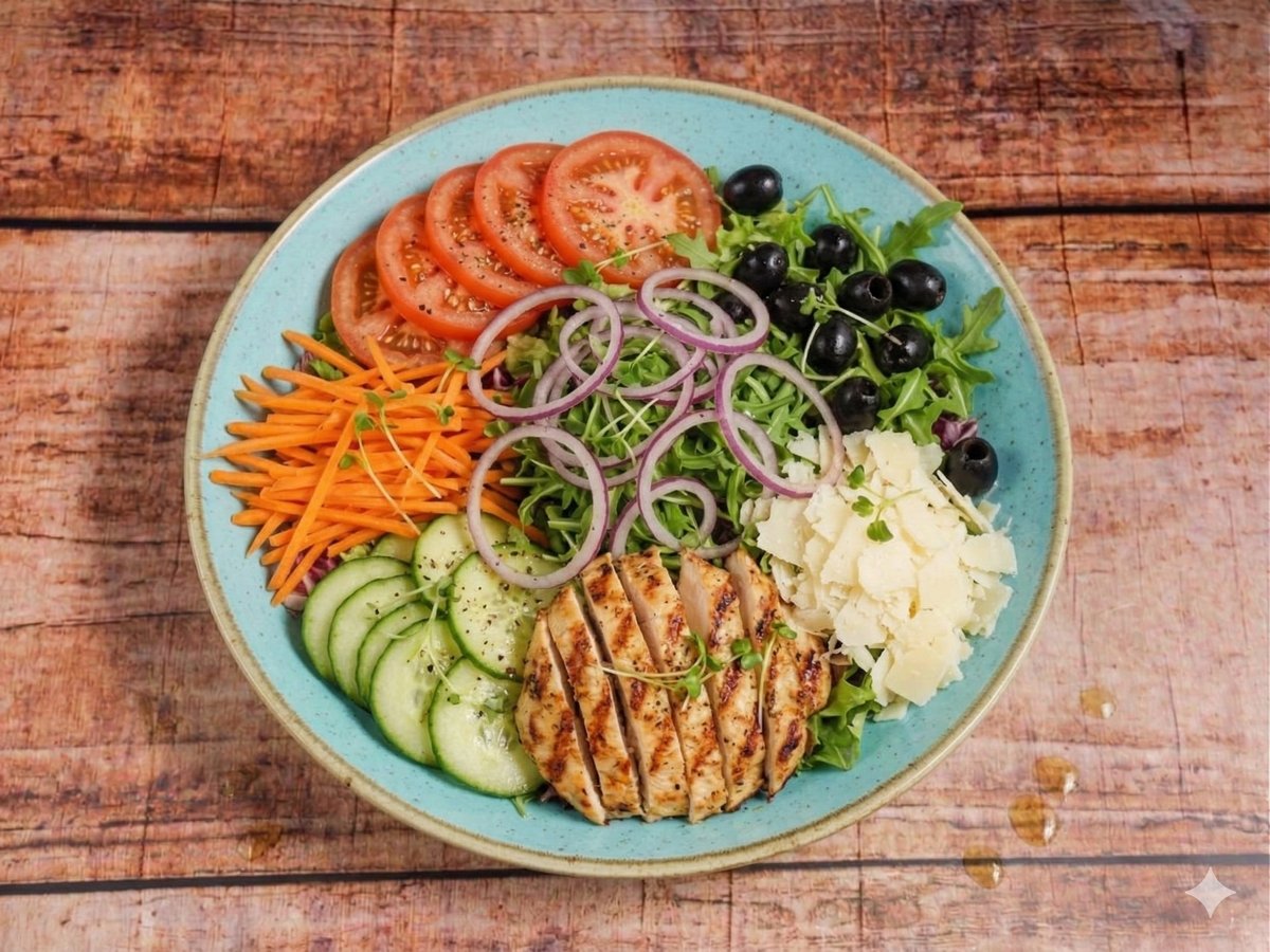 mit gegrillten Hähnchenstreifen, Möhrenstreifen, Parmesan, Rucola, Gurke, Tomate, Zwiebel, Blattsalat und Oliven