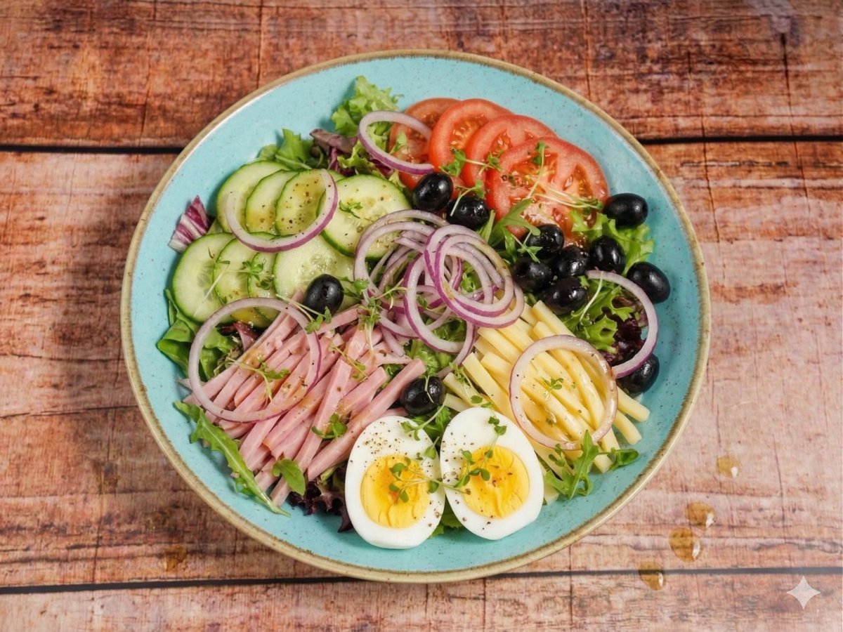 mit saftigem Kochschinken, feinen Käsestreifen, sonnengereiften Tomaten, Gurken, roten Zwiebeln, garniert mit schwarzen Oliven und einem hartgekochten Ei