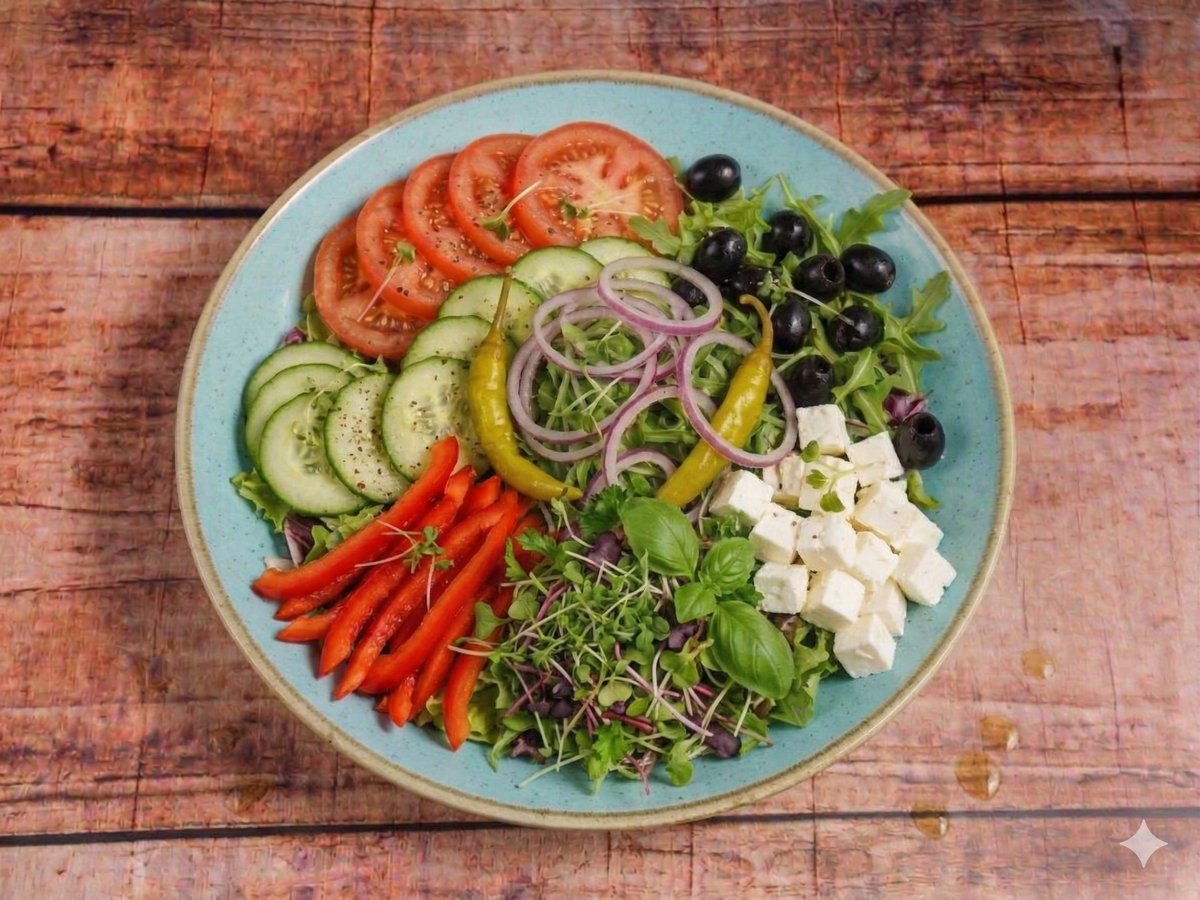 mit Schafskäse, Mais, schwarzen Oliven, Paprika-Streifen, Gurke, Blattsalat und Peperoni