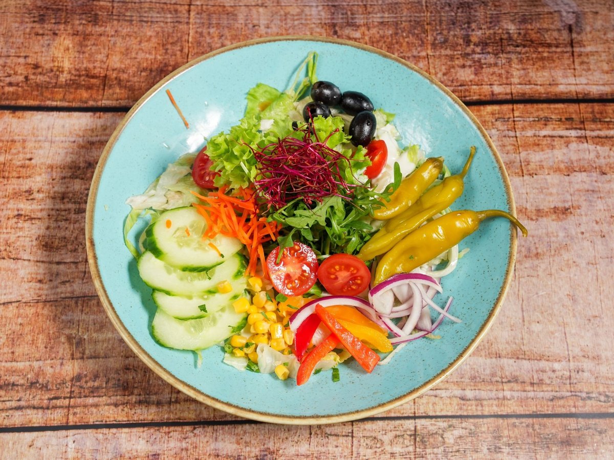 mit Tomaten, Gurken, Möhrenstreifen, Mais, Blattsalat und Zwiebeln