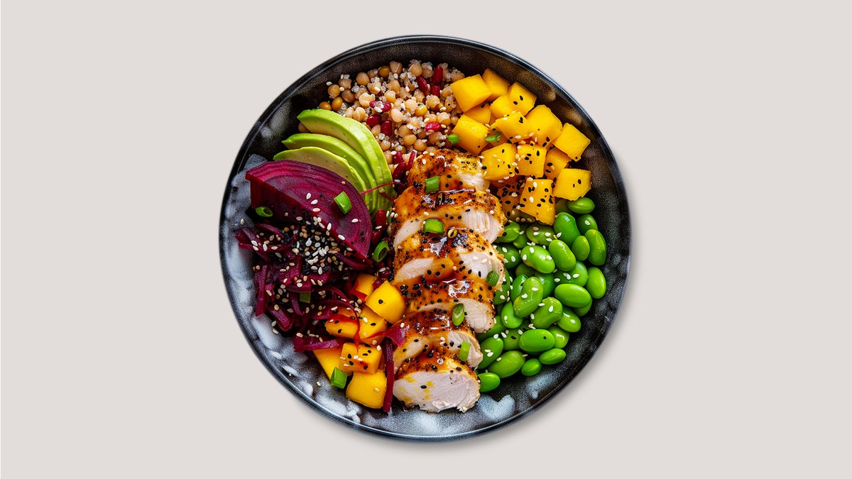 alle Bowls werden mit Bulgur, Salat, Edamame, Avocado, Mango, Chia-Samen und Goji-Beeren serviert