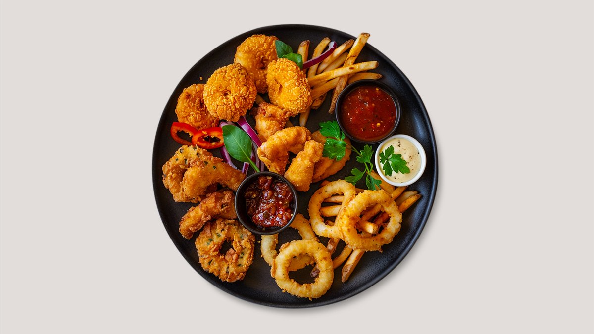 Pommes 3x Chicken Nuggets 3x Chili-Cheese Nuggets 3x Mozzarella Sticks 3x Onion Rings 3x Crispy Chicken Fingers