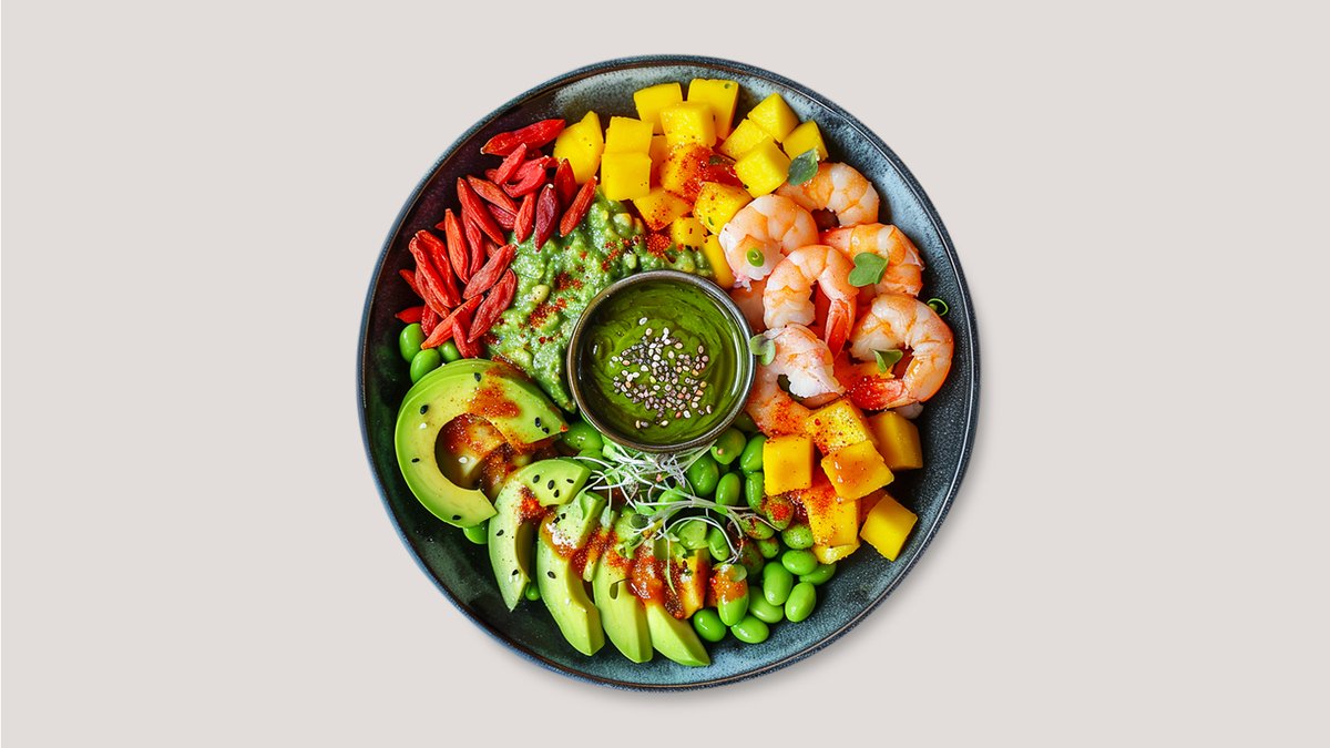 mit Avocado-Mayonnaise, Algensalat und Gambas