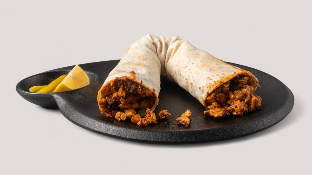 chicken tantuni, freshly seasoned and rolled in a wrap with yoghurt sauce, classic Mersin style with a fresh touch