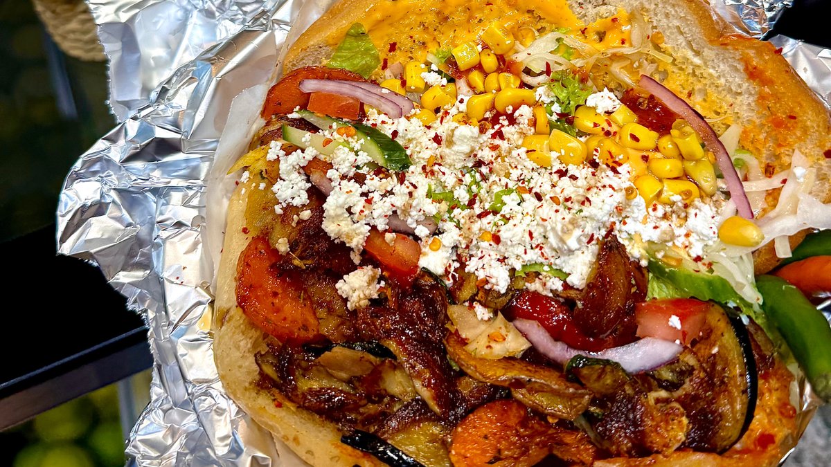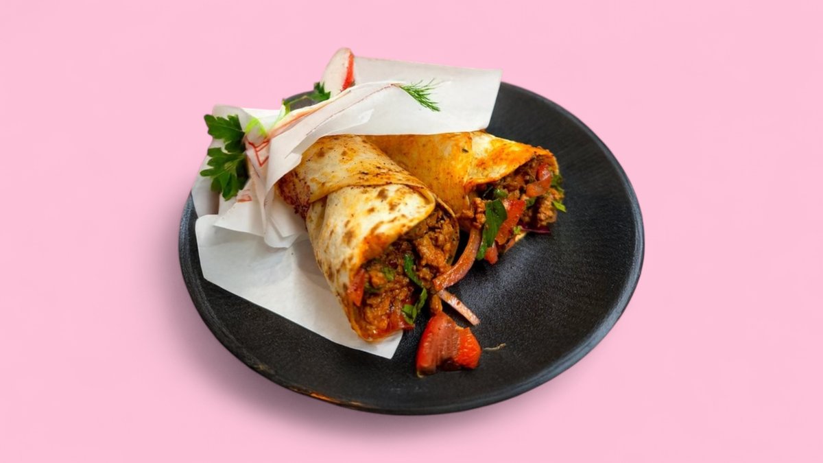 beef tantuni in crispy flatbread with tomatoes, onions, mint and parsley, original street food from Mersin