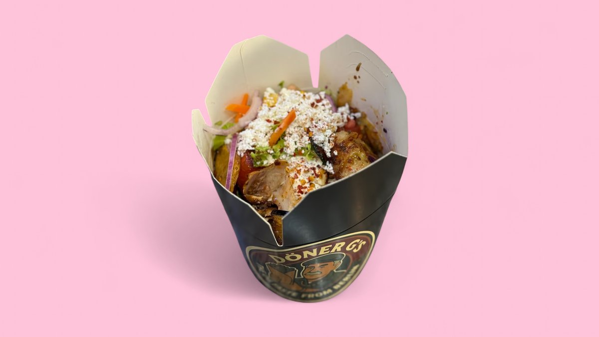 all dishes are served with chicken meat served directly from the spit, fresh salad, Berlin sauce, fried vegetables and an ingredient of your choice