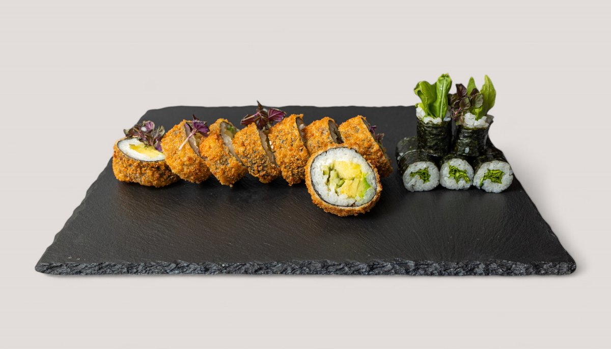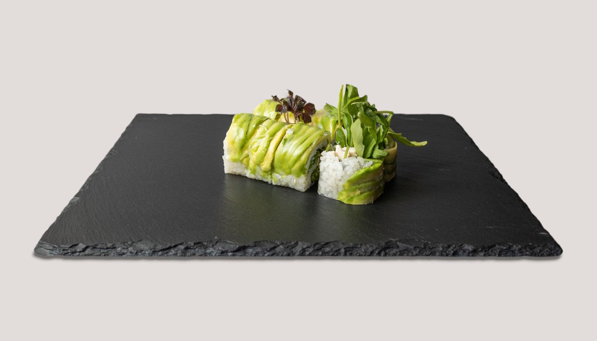 mit Tofu, Rucola, Shiitake, veganem Frischkäse, umhüllt mit Avocado