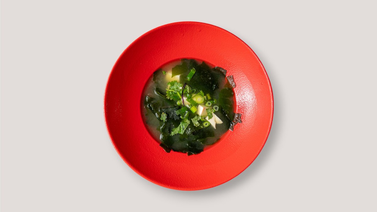 Miso-Suppe aus leichter Dashi-Brühe mit Tofu, würzigem Seetang und Frühlingszwiebeln