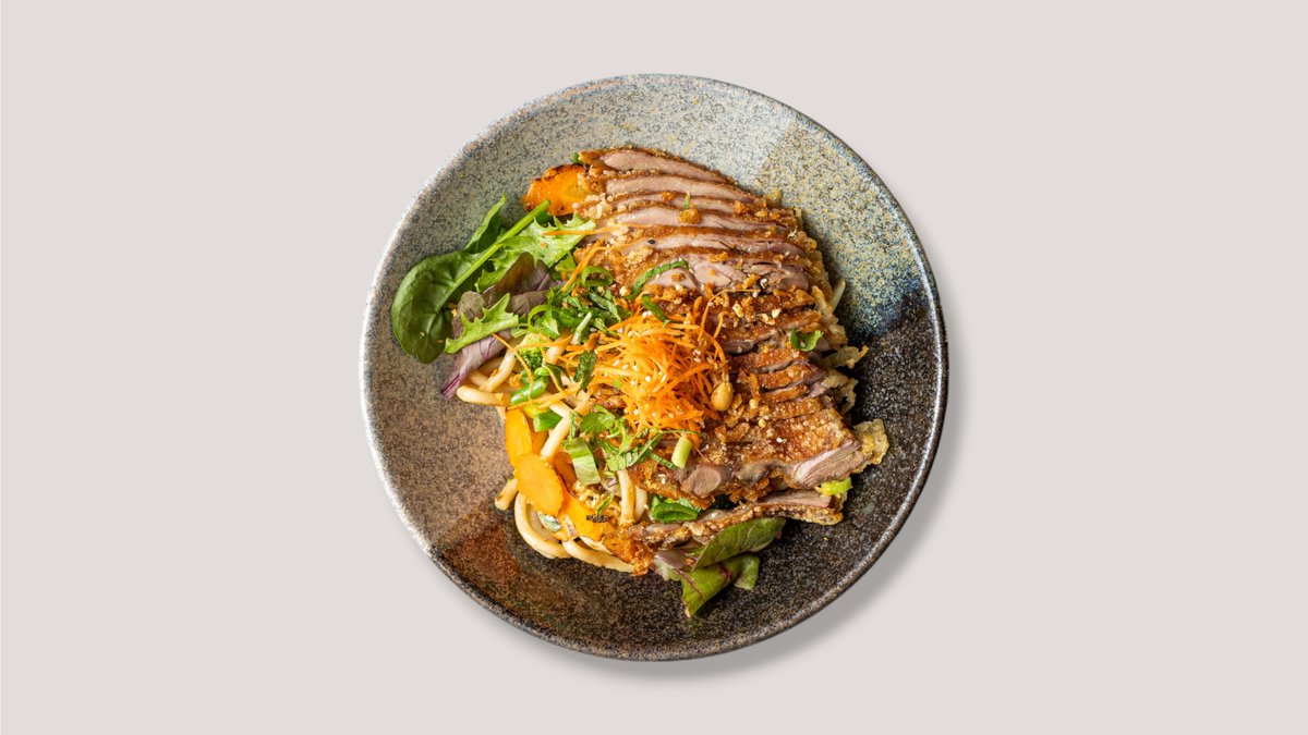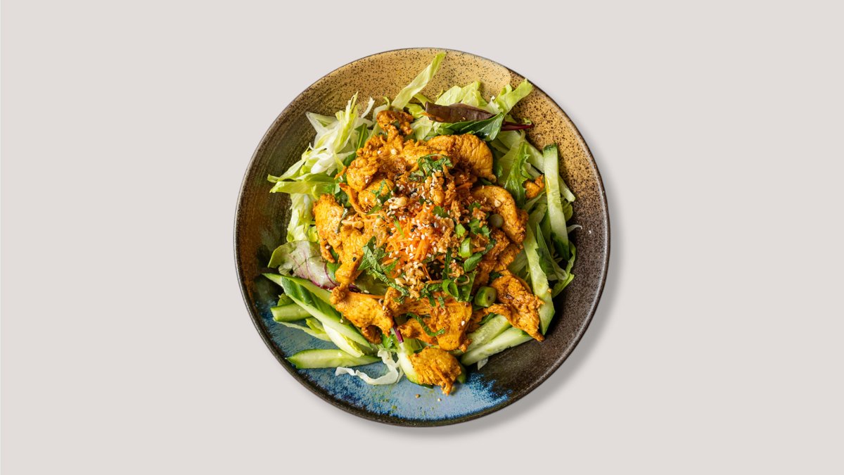 mit dünnen Nudeln aus Reismehl, Eisbergsalat, Minzblättern, Gurkenstreifen, eingelegten Karottenstreifen, tradittioneller Soße und einer Zutat deiner Wahl, garniert mit Erdnüssen und Röstzwiebeln