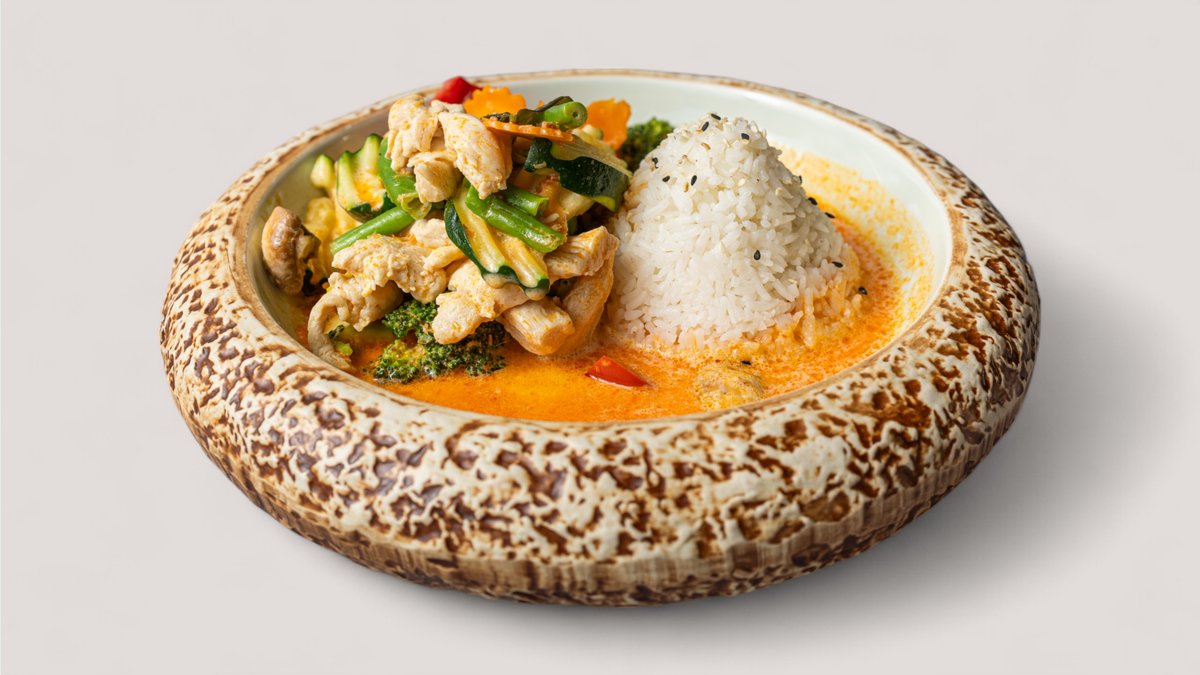 zartes Hähnchenfilet mariniert mit Zitronengras und rotem Curry, kurz angebraten mit Ananas auf frischen Gemüsen in traditioneller Soße, garniert mit Kräutern, Erdnüssen und Röstzwiebeln