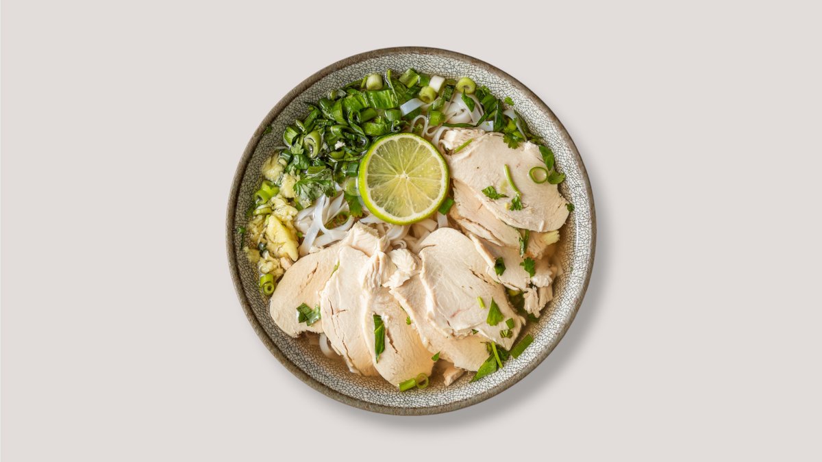 mit einer kräftigen klaren Brühe, Reisbandnudeln, Lauchringe, Koriandergrün und einer Fleischsorte deiner Wahl