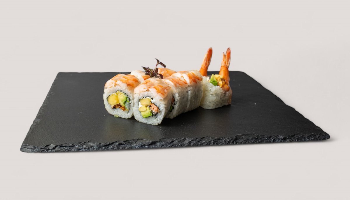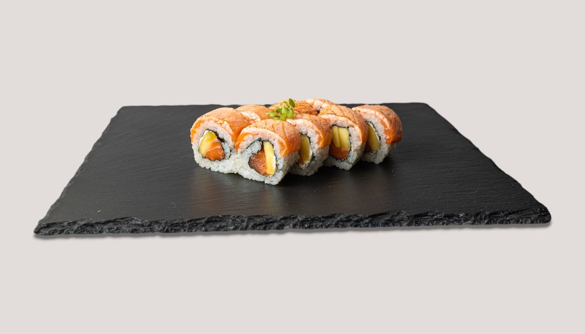 mit Tempura-Garnelen, Mango, Avocado, umhüllt von flambiertem Lachs mit einem Hauch von Frischkäse