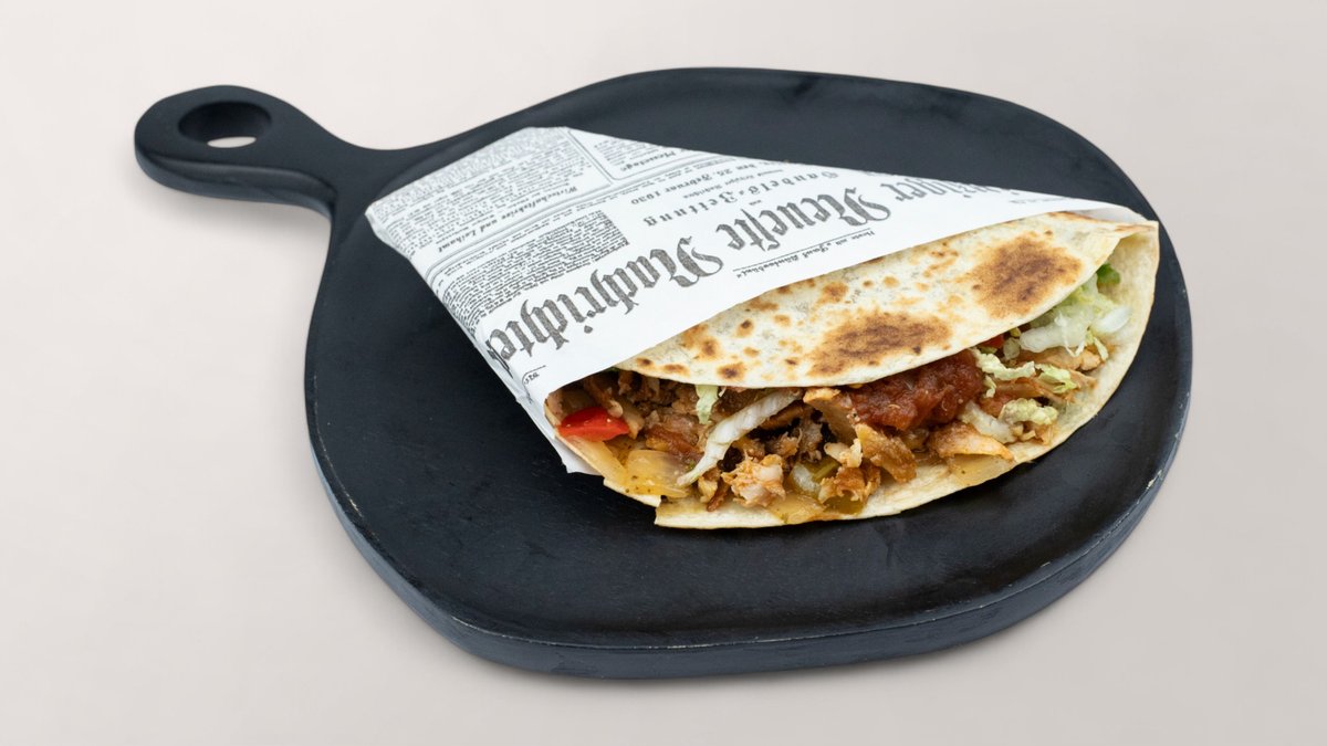 gefüllt mit saftig gegrilltem Geflügelfleisch vom hausgemachten Spieß, gebratener Paprika, Zwiebeln, Bohnenpüree, Tomaten, Salat und mexikanischer Salsa