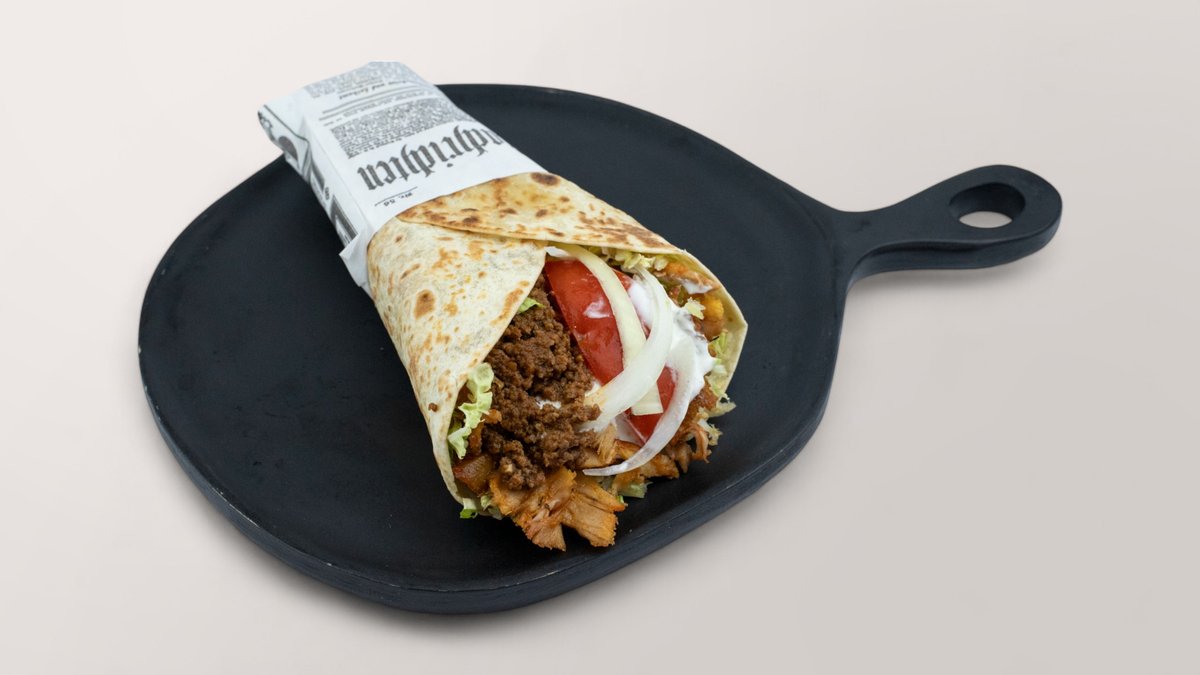 gefüllt mit Geflügelfleisch vom Spieß, Rinderhackfleisch, frischem Salat, Tomaten, Zwiebeln und Soße