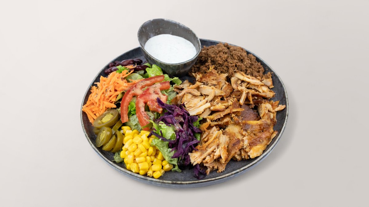 mit saftig gegrilltem Geflügelfleisch vom Spieß, frischem Salat, Tomaten, Zwiebeln, Karotten, Krautsalat, Bohnen, Mais, Soße, Peperoni und einer Tortilla