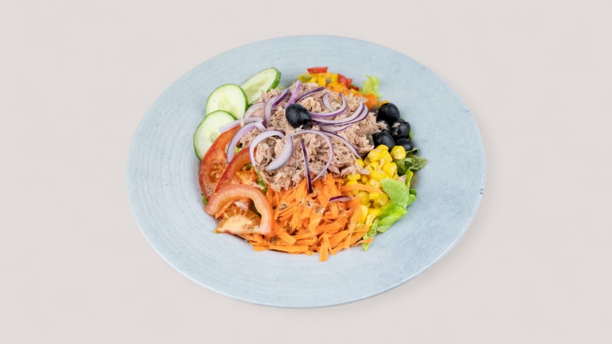 mit gemischtem Salat, roten Zwiebeln, Oliven und Thunfisch