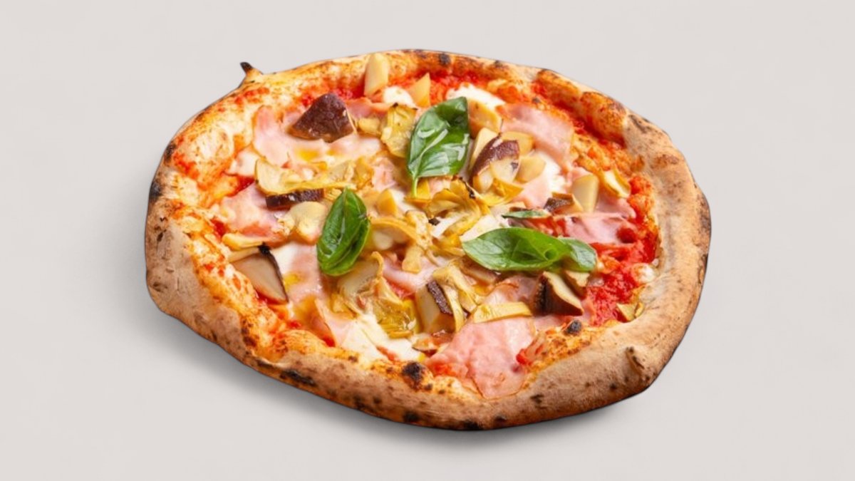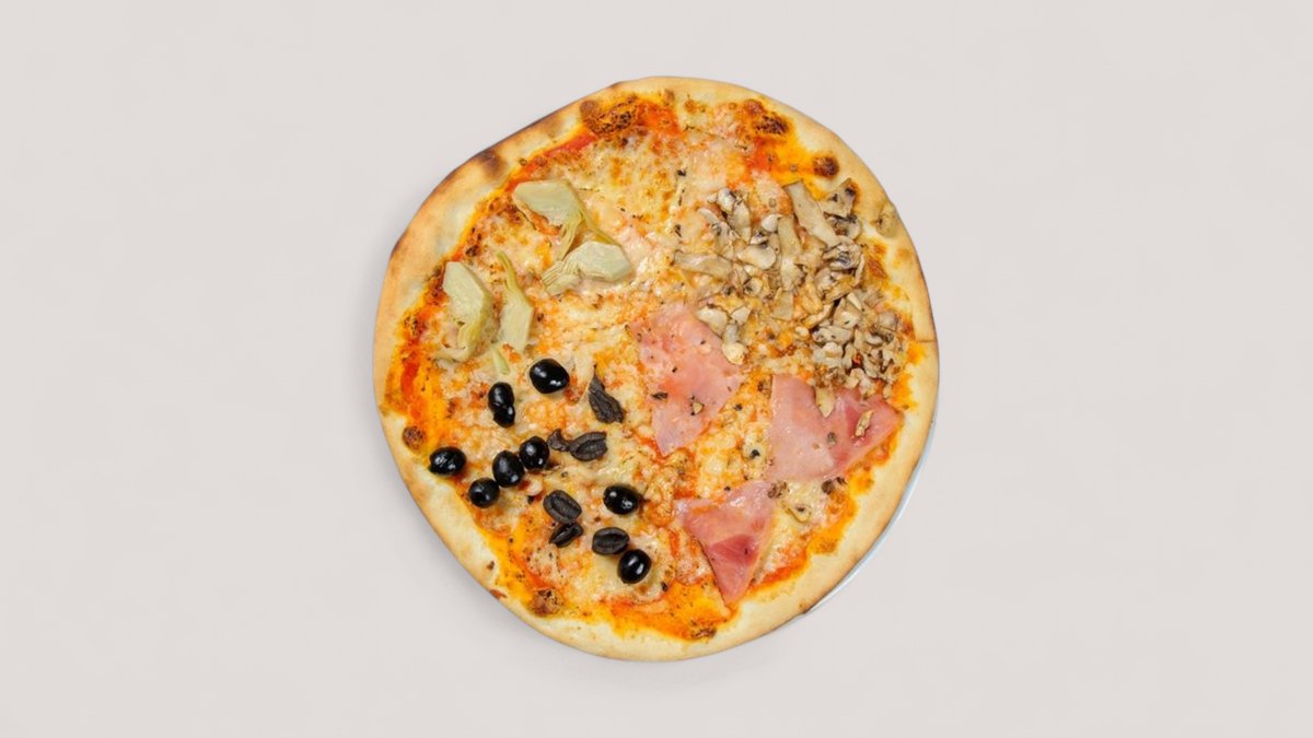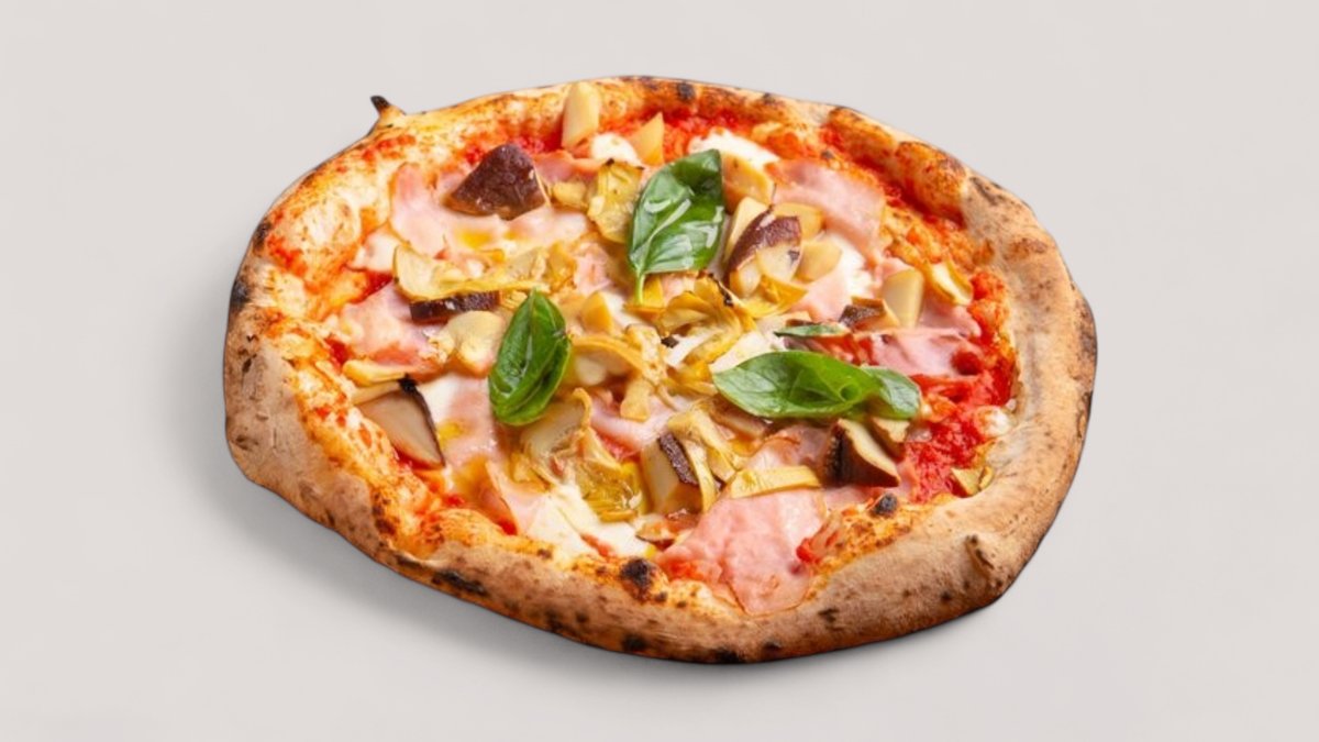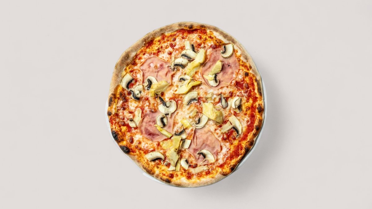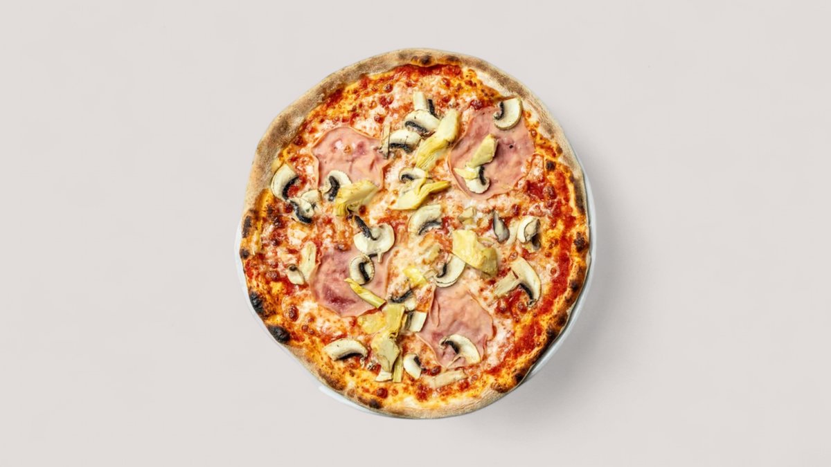 mit Champignons, Artischocken, gekochtem Schinken und Oliven