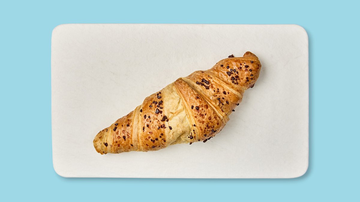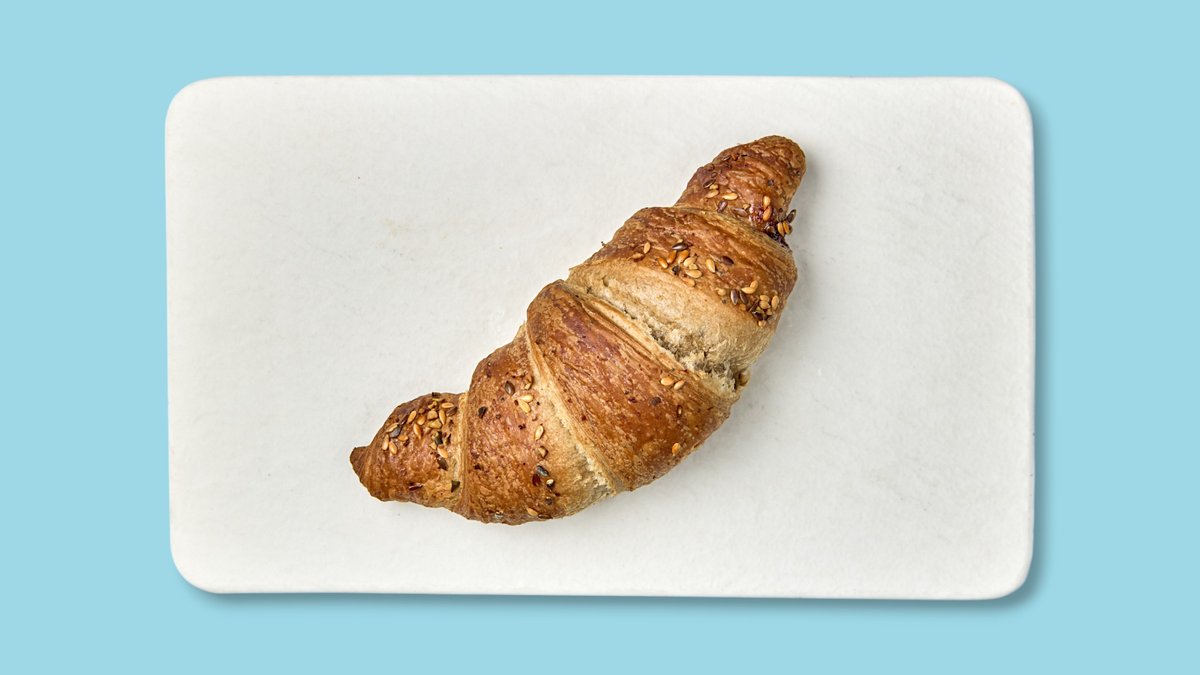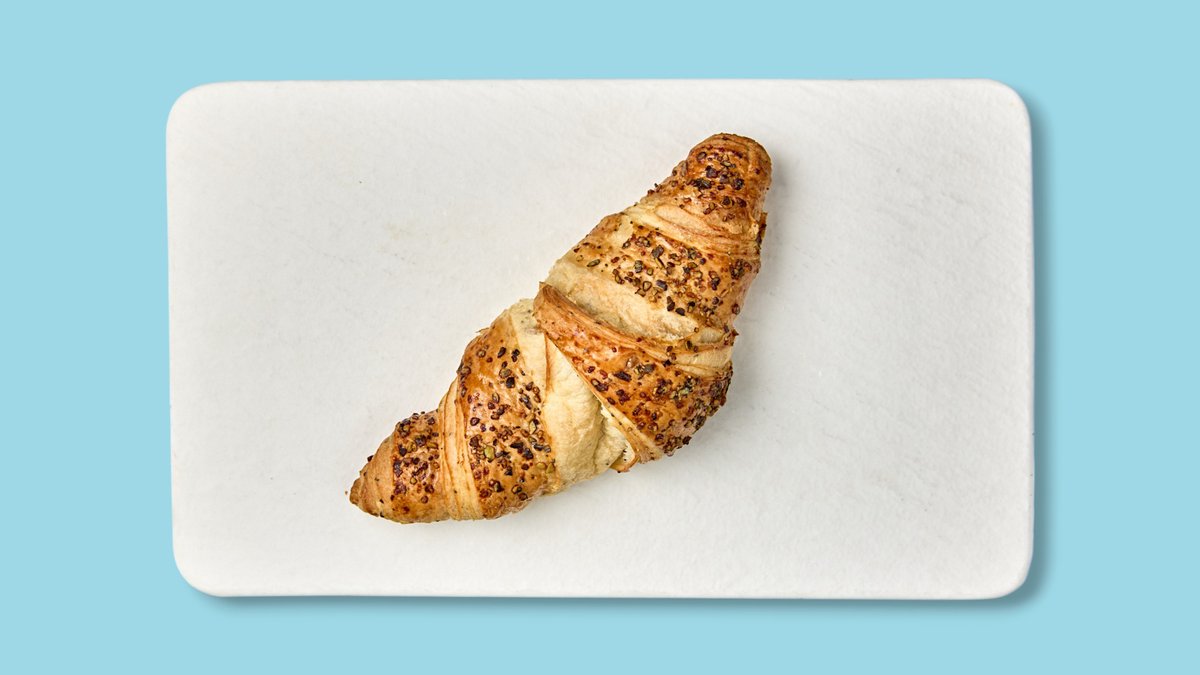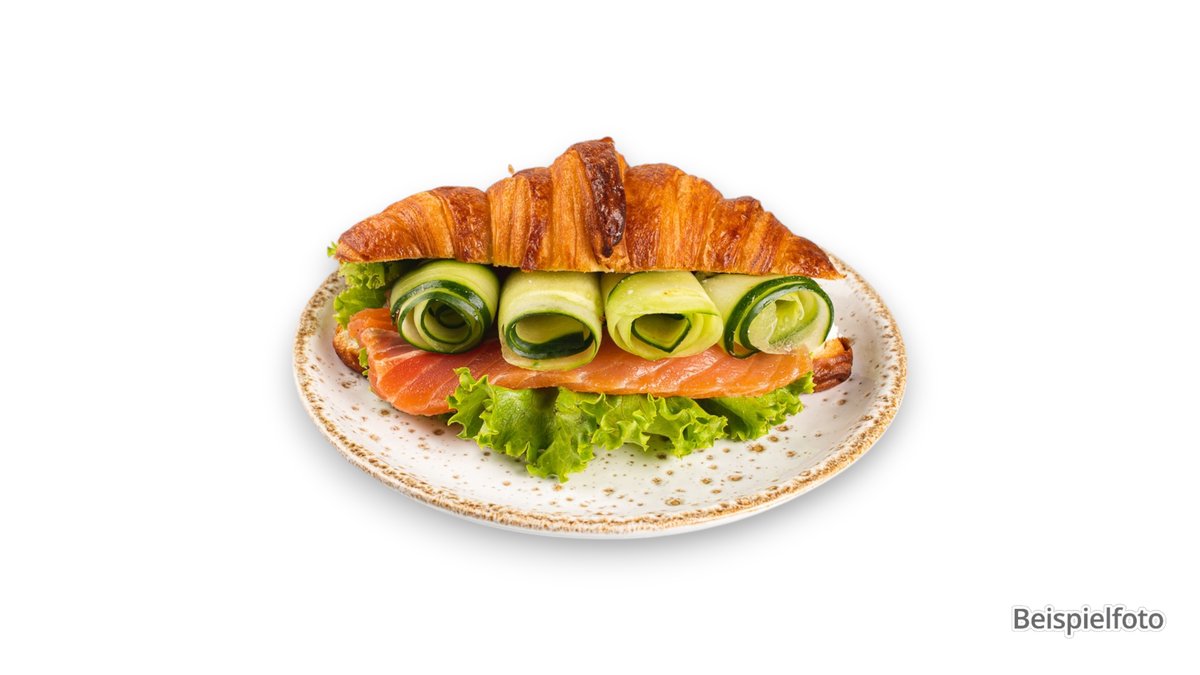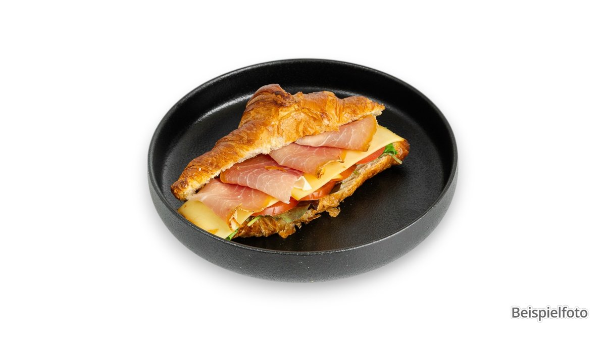 croissant with scrambled eggs, bresaola, smoked beef ham or wild salmon, cherry tomatoes, radishes, cream cheese and arugula