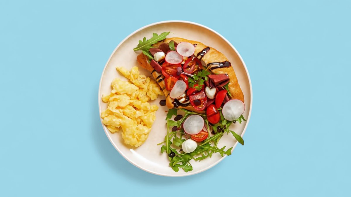 croissant with scrambled eggs, cherry tomatoes, mozzarella, arugula, bresaola, beef ham, radishes and cream cheese