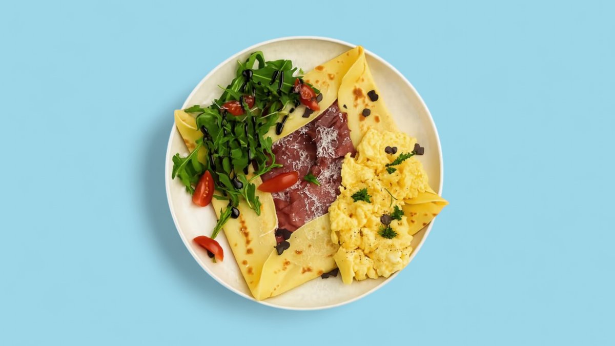 bresaola beef ham, cherry tomatoes, parsley, Parmesan, scrambled eggs, cream cheese and arugula