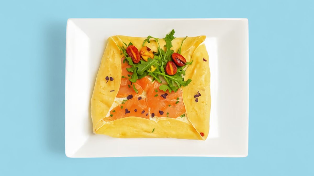 croissant with avocado cream, smoked wild salmon, arugula, cherry tomatoes, radishes and scrambled eggs
