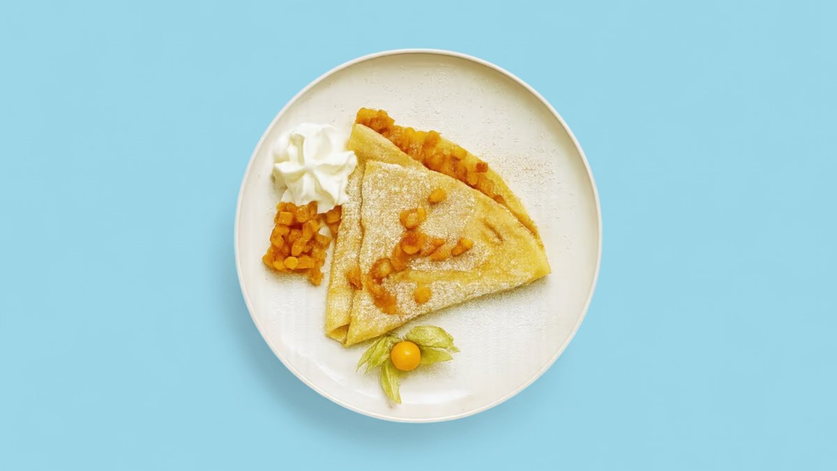 homemade apple strudel, honey, cinnamon, sugar, physalis, powdered sugar and cream