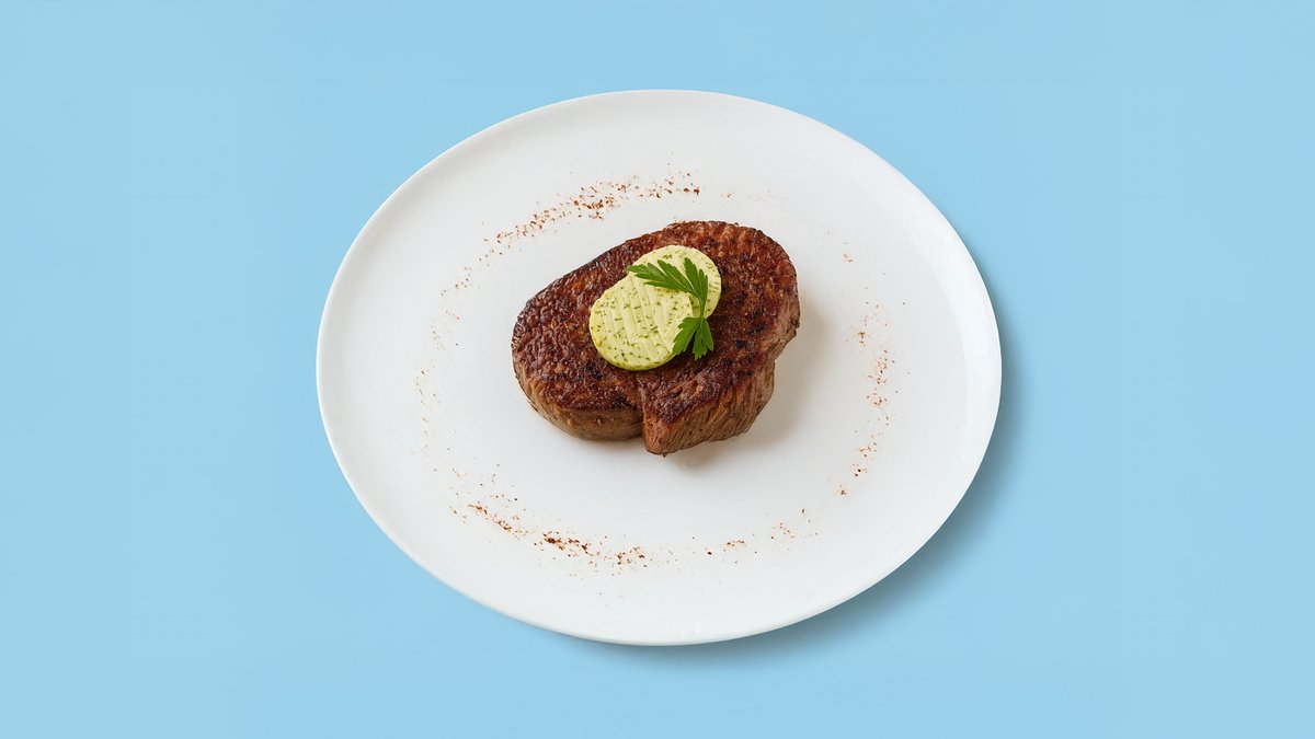 350g american black angus steak with herb butter, cooked medium-rare