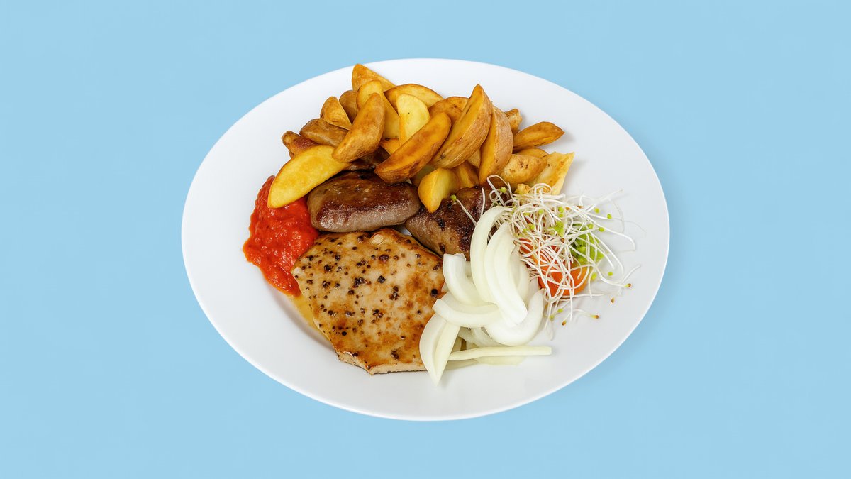 250g various cuts of meat (beef, turkey and pork), ajvar, herb butter, onions, pork bacon, and wedges, medium-roast beef