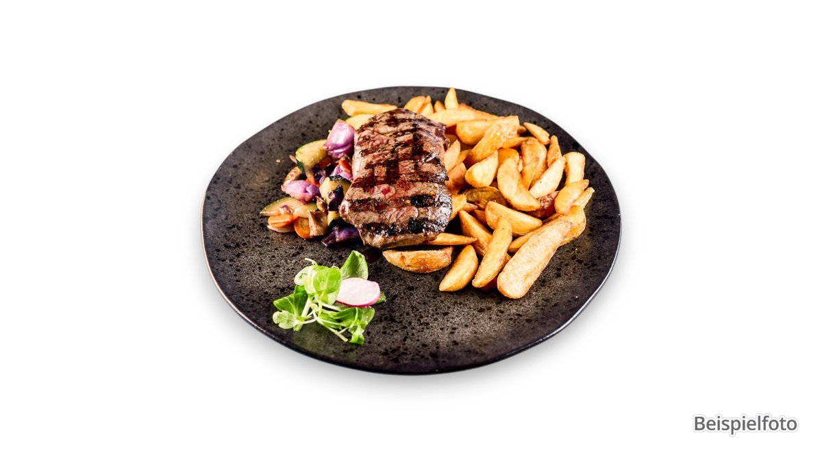 200g beef rump steak with caramelized onions, red wine sauce, and croquettes, cooked medium-rare contains alcohol, not suitable for children or pregnant women