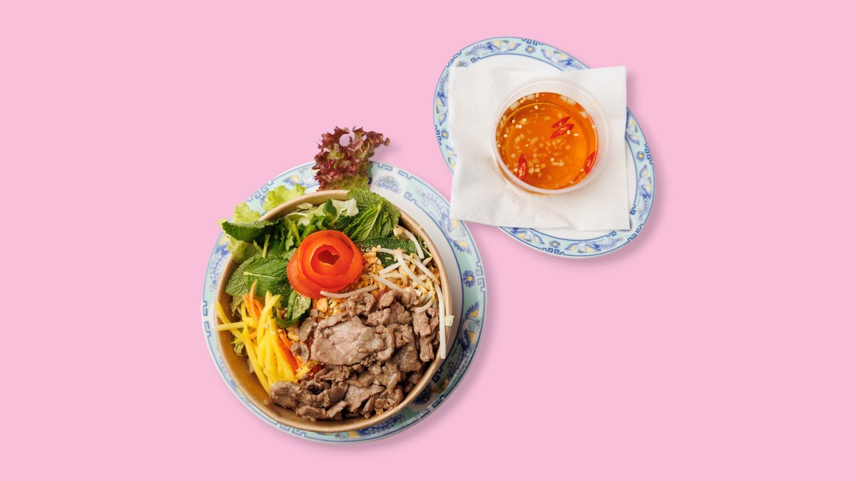 alle Gerichte werden mit lauwarmem vietnamesischem Reisnudelsalat, Gurken, Sojasprossen, gerösteten Zwiebeln, Erdnüssen, frischer Minze, Koriander und fruchtiger Zitronen-Fischsoße