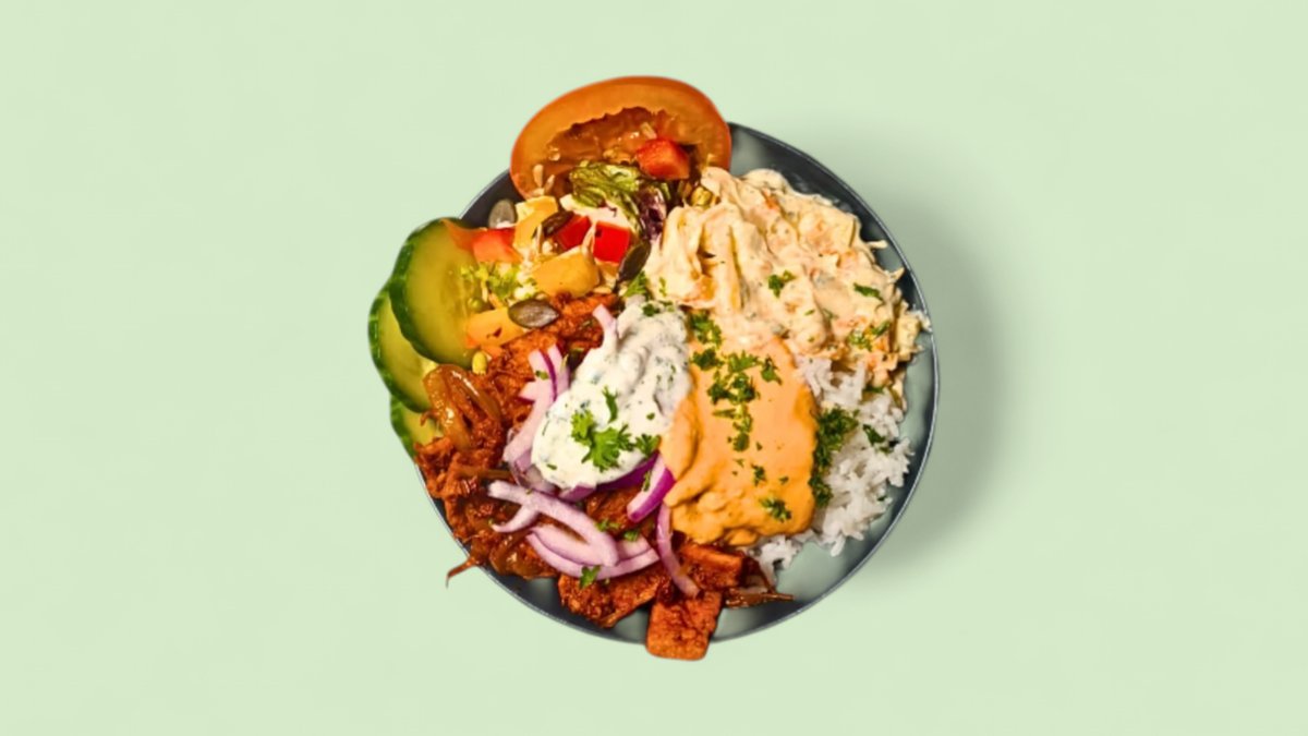 with pea protein gyros, rice, coleslaw, red onions, mixed salad, herb dip and autumn dip