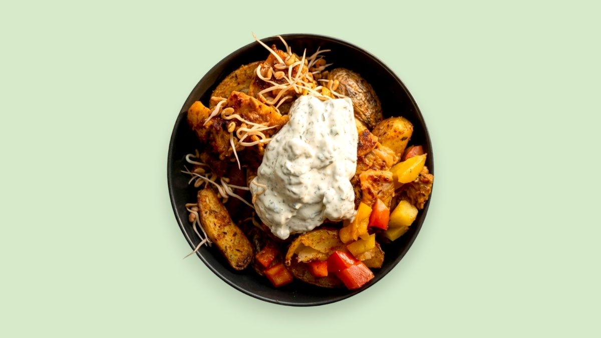fried herb potatoes topped with pea protein gyros, herb dip, home-grown sprouts and diced bell peppers