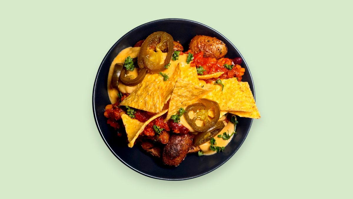 fried herb potatoes topped with chili sin carne, cheeze sauce, tortilla chips and jalapeños