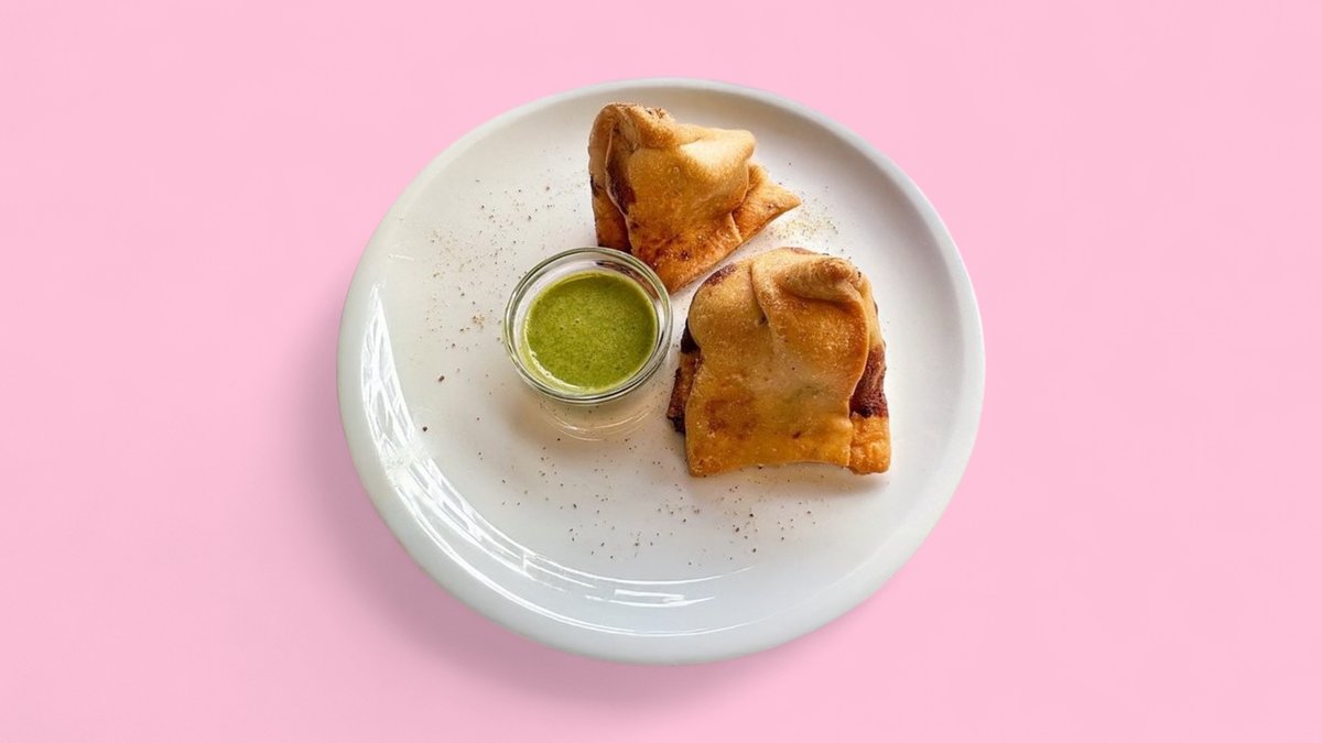 zwei Teigtaschen mit Kartoffel-Erbsen-Füllung, dazu Minze-Koriander-Chutney